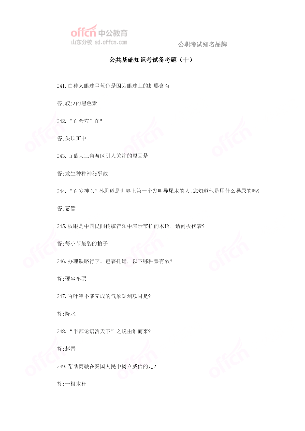 公职考试知名品牌公共基础知识考试备考题(十)241.白种人眼珠呈蓝色是因为眼珠上的虹膜含有答;较少的黑色素242.“百会穴”在?答;头顶正中243.百慕大三角海区引人关注的原因是答;发生种种神秘事故244.“百岁神医”孙思邈是世界上第一个发明导尿术的人,您知道他是用什么导尿的吗?答;葱管245.板眼是中国民间传统音乐中表示节拍的术语,请问板代表?答;每小节最弱的拍子246.办理铁路行李、包裹托运,以下哪种票有效?答;硬坐车票247.百叶箱不能完成的气象观测项目是?答;降水248.“半部论语治天下”之说由谁