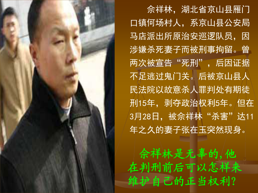 佘祥林,湖北省京山县雁门口镇何场村人,系京山县公安局马店派出所原治安巡逻队员,因涉嫌杀死妻子而被刑事拘留。曾两次被宣告“死刑”,后因证据不足逃过鬼门关。后被京山县人民法院以故意杀人罪判处有期徒刑15年,剥夺政治权利5年。但在3月28日,被佘祥林“杀害”达11年之久的妻子张在玉突然现身。民主监督:守望公共家园1、你还记得第一课提到我国公民依法享有哪些政治权利吗?这是由什么决定的?2、什么是监督权?3、谁来监督?监督谁?4、我国公民监督权的具体内容是什么?5、我国公民行使监督权的合法渠道有哪些?6、如何负责任