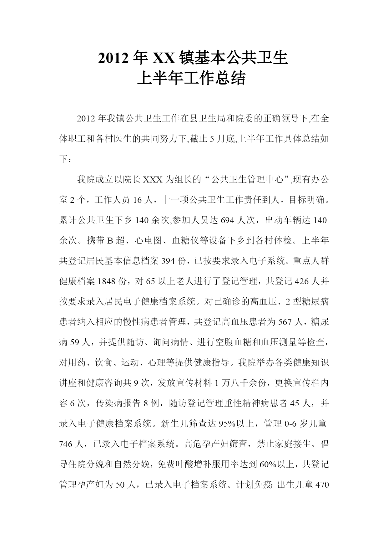 2012年XX镇基本公共卫生上半年工作总结2012年我镇公共卫生工作在县卫生局和院委的正确领导下,在全体职工和各村医生的共同努力下,截止5月底,上半年工作具体总结如下:我院成立以院长XXX为组长的“公共卫生管理中心”,现有办公室2个,工作人员16人,十一项公共卫生工作责任到人,目标明确。累计公共卫生下乡140余次,参加人员达694人次,出动车辆达140余次。携带B超、心电图、血糖仪等设备下乡到各村体检。上半年共登记居民基本信息档案394份,已按要求录入电子系统。重点人群健康档案1848份,对65以上老人进