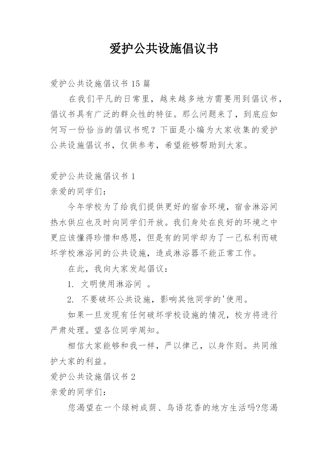爱护公共设施倡议书爱护公共设施倡议书15篇在我们平凡的日常里,越来越多地方需要用到倡议书,倡议书具有广泛的群众性的特征。那么问题来了,到底应如何写一份恰当的倡议书呢?下面是小编为大家收集的爱护公共设施倡议书,仅供参考,希望能够帮助到大家。爱护公共设施倡议书1亲爱的同学们:今年学校为了给我们提供更好的宿舍环境,宿舍淋浴间热水供应也及时向同学们开放。我们身处在良好的环境之中更应该懂得珍惜和感恩,但是有的同学却为了一己私利而破坏学校淋浴间的公共设施,造成淋浴器不能正常工作。在此,我向大家发起倡议:1.文明使用淋