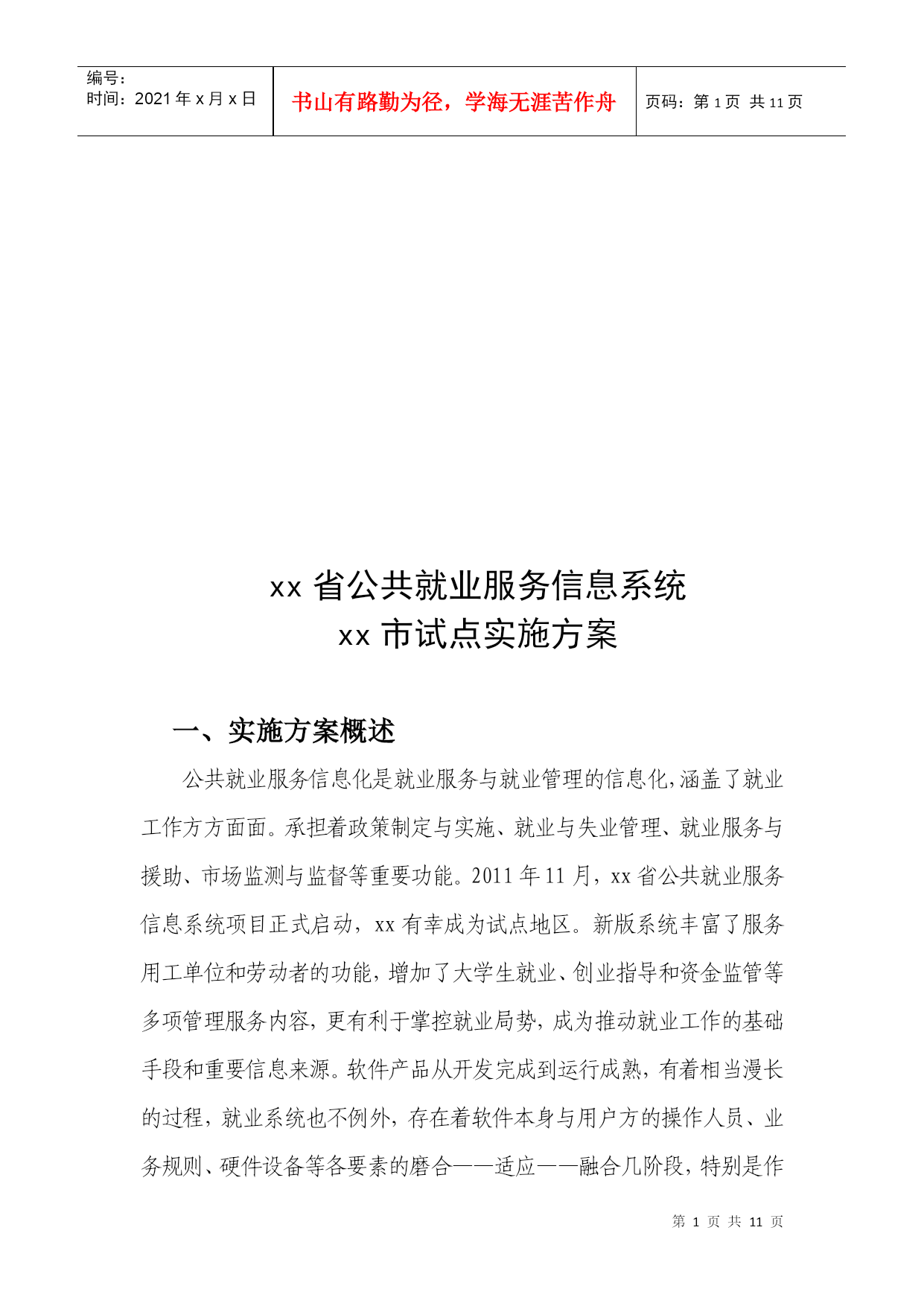 编号:时间:2021年x月x日书山有路勤为径,学海无涯苦作舟页码:第PAGE11页共NUMPAGES11页第PAGE\*MERGEFORMAT11页共NUMPAGES\*MERGEFORMAT11页xx省公共就业服务信息系统xx市试点实施方案一、实施方案概述公共就业服务信息化是就业服务与就业管理的信息化,涵盖了就业工作方方面面。承担着政策制定与实施、就业与失业管理、就业服务与援助、市场监测与监督等重要功能。2011年11月,xx省公共就业服务信息系统项目正式启动,xx有幸成为试点地