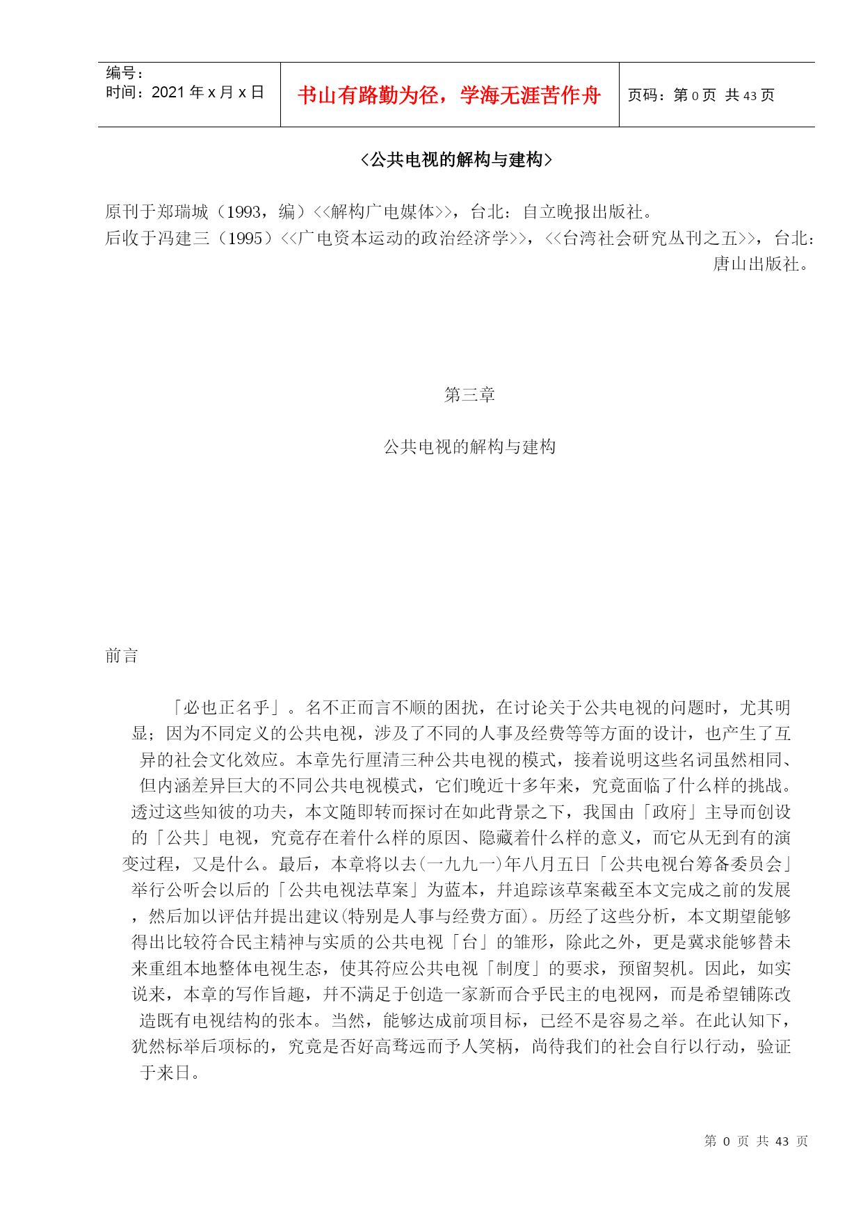 编号:时间:2021年x月x日书山有路勤为径,学海无涯苦作舟页码:第PAGE42页共NUMPAGES43页第PAGE\*MERGEFORMAT42页共NUMPAGES\*MERGEFORMAT43页<公共电视的解构与建构>原刊于郑瑞城(1993,编)<<解构广电媒体>>,台北:自立晚报出版社。后收于冯建三(1995)<<广电资本运动的政治经济学>>,<<台湾社会研究丛刊之五>>,台北:唐山出版社。第三章公共电视的解构与建构前言「必也正名乎」。名不正而言不顺的困扰,在讨论关于公共电视