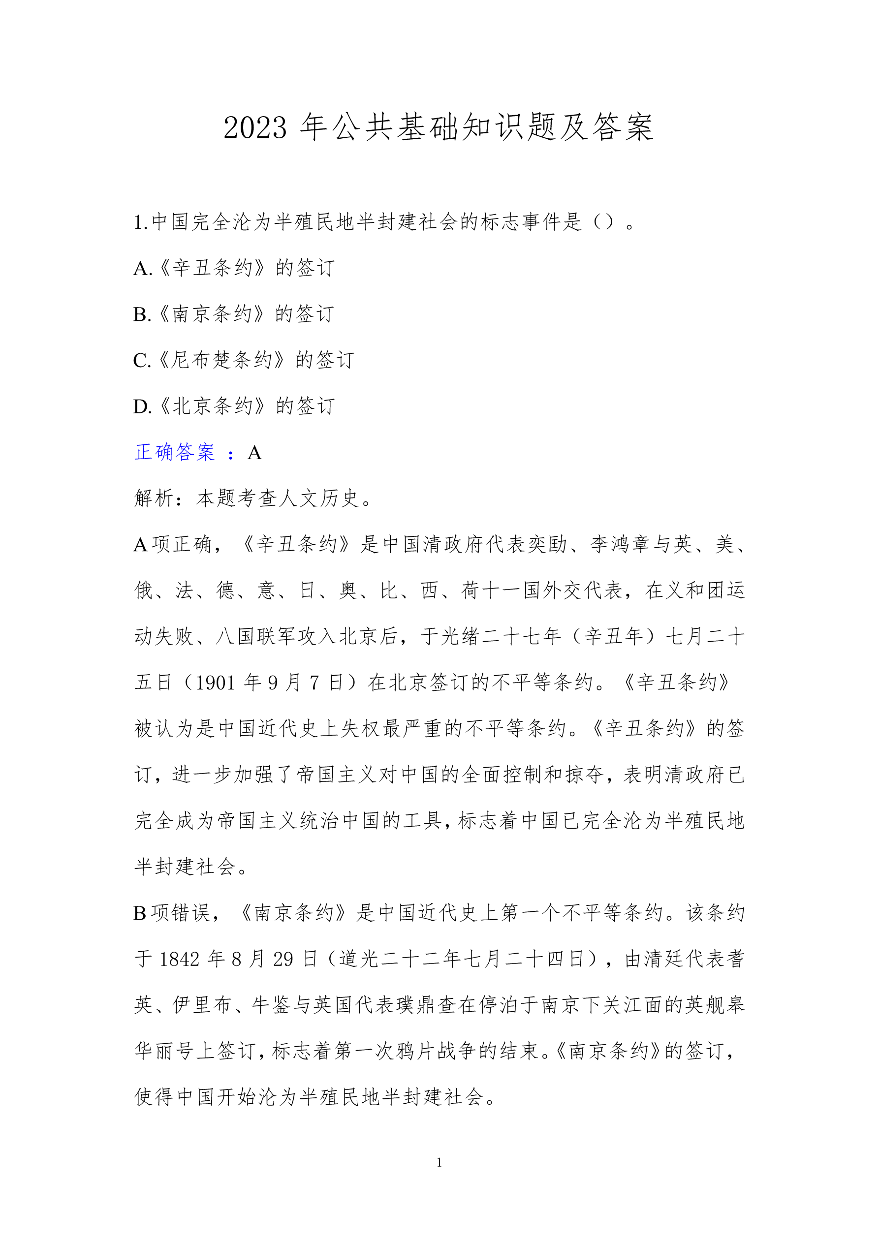 2023年公共基础知识题及答案1.中国完全沦为半殖民地半封建社会的标志事件是()。A.《辛丑条约》的签订B.《南京条约》的签订C.《尼布楚条约》的签订D.《北京条约》的签订正确答案:A解析:本题考查人文历史。A项正确,《辛丑条约》是中国清政府代表奕劻、李鸿章与英、美、俄、法、德、意、日、奥、比、西、荷十一国外交代表,在义和团运动失败、八国联军攻入北京后,于光绪二十七年(辛丑年)七月二十五日(1901年9月7日)在北京签订的不平等条约。《辛丑条约》被认为是中国近代史上失权最严重的不平等条约。《辛丑条约》的签