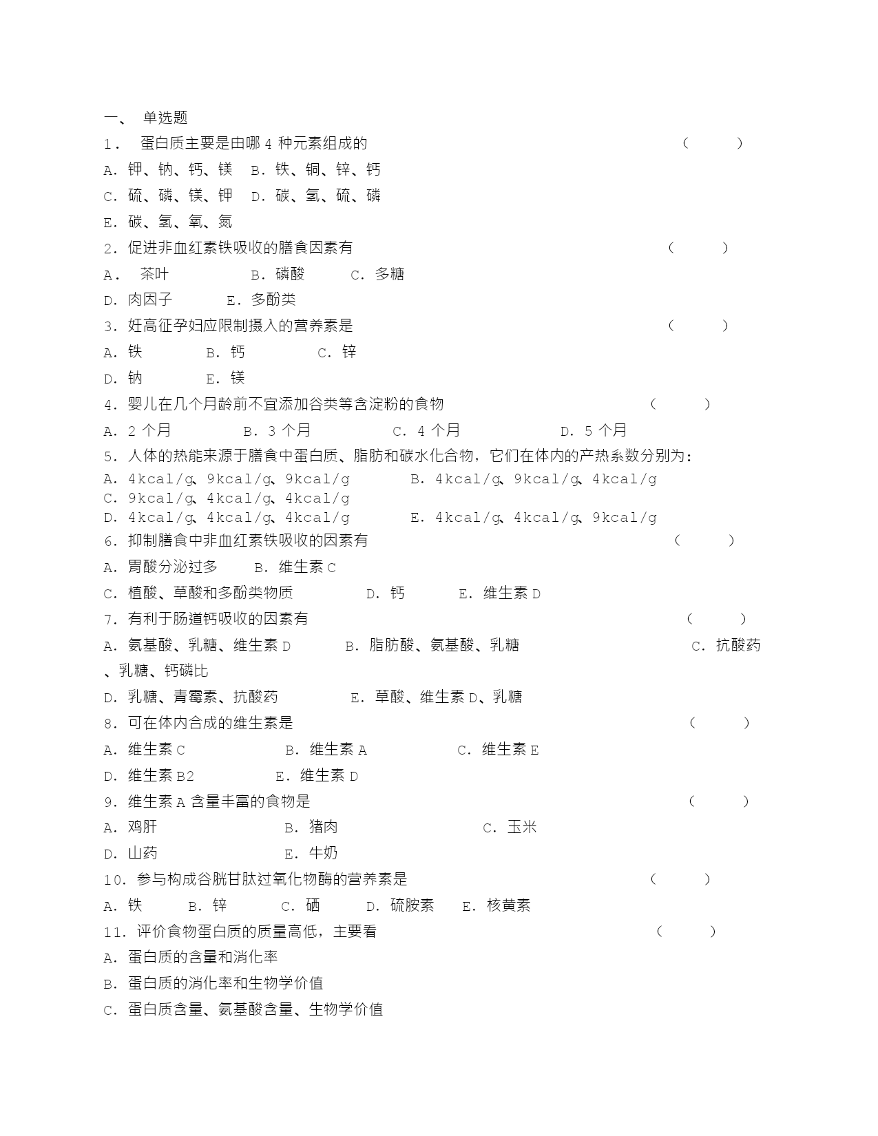 一、单选题蛋白质主要是由哪4种元素组成的()A.钾、钠、钙、镁B.铁、铜、锌、钙C.硫、磷、镁、钾D.碳、氢、硫、磷E.碳、氢、氧、氮2.促进非血红素铁吸收的膳食因素有()茶叶B.磷酸C.多糖D.肉因子E.多酚类3.妊高征孕妇应限制摄入的营养素是()A.铁B.钙C.锌D.钠E.镁4.婴儿在几个月龄前不宜添加谷类等含淀粉的食物()A.2个月B.3个月C.4个月D.5个月5.人体的热能来源于膳食中蛋白质、脂肪和碳水化合物,它们在体内的产热系数分别为:A.4kcal/g、9kcal/g、9kcal/gB.4kc