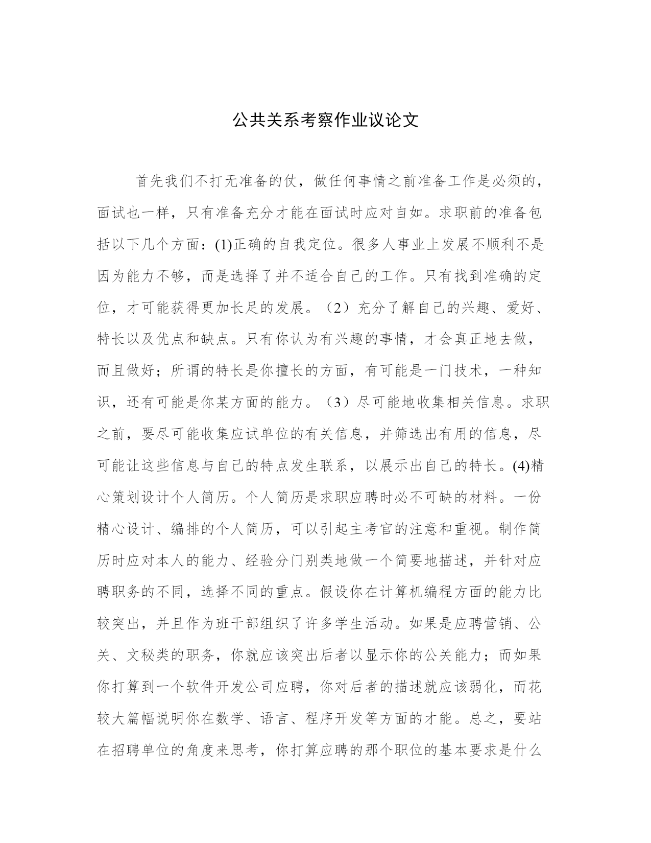 公共关系考察作业议论文首先我们不打无准备的仗,做任何事情之前准备工作是必须的,面试也一样,只有准备充分才能在面试时应对自如。求职前的准备包括以下几个方面:(1)正确的自我定位。很多人事业上发展不顺利不是因为能力不够,而是选择了并不适合自己的工作。只有找到准确的定位,才可能获得更加长足的发展。(2)充分了解自己的兴趣、爱好、特长以及优点和缺点。只有你认为有兴趣的事情,才会真正地去做,而且做好;所谓的特长是你擅长的方面,有可能是一门技术,一种知识,还有可能是你某方面的能力。(3)尽可能地收集相关信息。求职之前