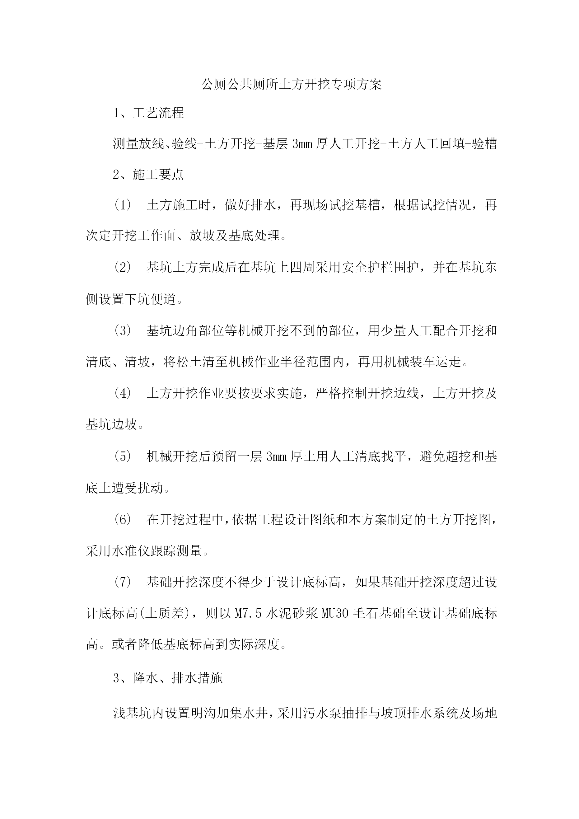 公厕公共厕所土方开挖专项方案1、工艺流程测量放线、验线-土方开挖-基层3mm厚人工开挖-土方人工回填-验槽2、施工要点土方施工时,做好排水,再现场试挖基槽,根据试挖情况,再次定开挖工作面、放坡及基底处理。基坑土方完成后在基坑上四周采用安全护栏围护,并在基坑东侧设置下坑便道。基坑边角部位等机械开挖不到的部位,用少量人工配合开挖和清底、清坡,将松土清至机械作业半径范围内,再用机械装车运走。土方开挖作业要按要求实施,严格控制开挖边线,土方开挖及基坑边坡。机械开挖后预留一层3mm厚土用人工清底找平,避免超挖和基底