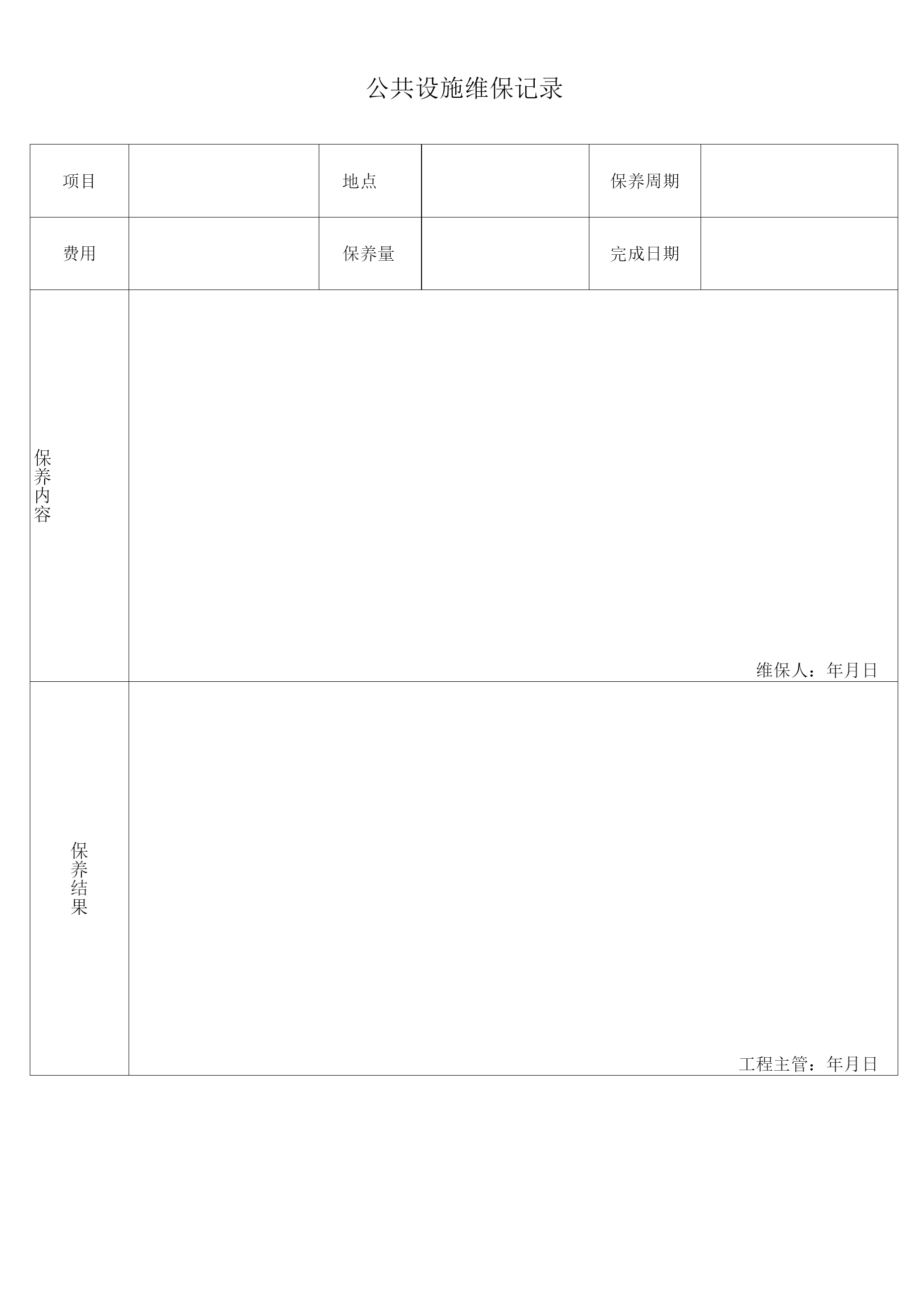 公共设施维保记录项目地点保养周期费用保养量完成日期保养内容维保人:年月日保养结果工程主管:年月日