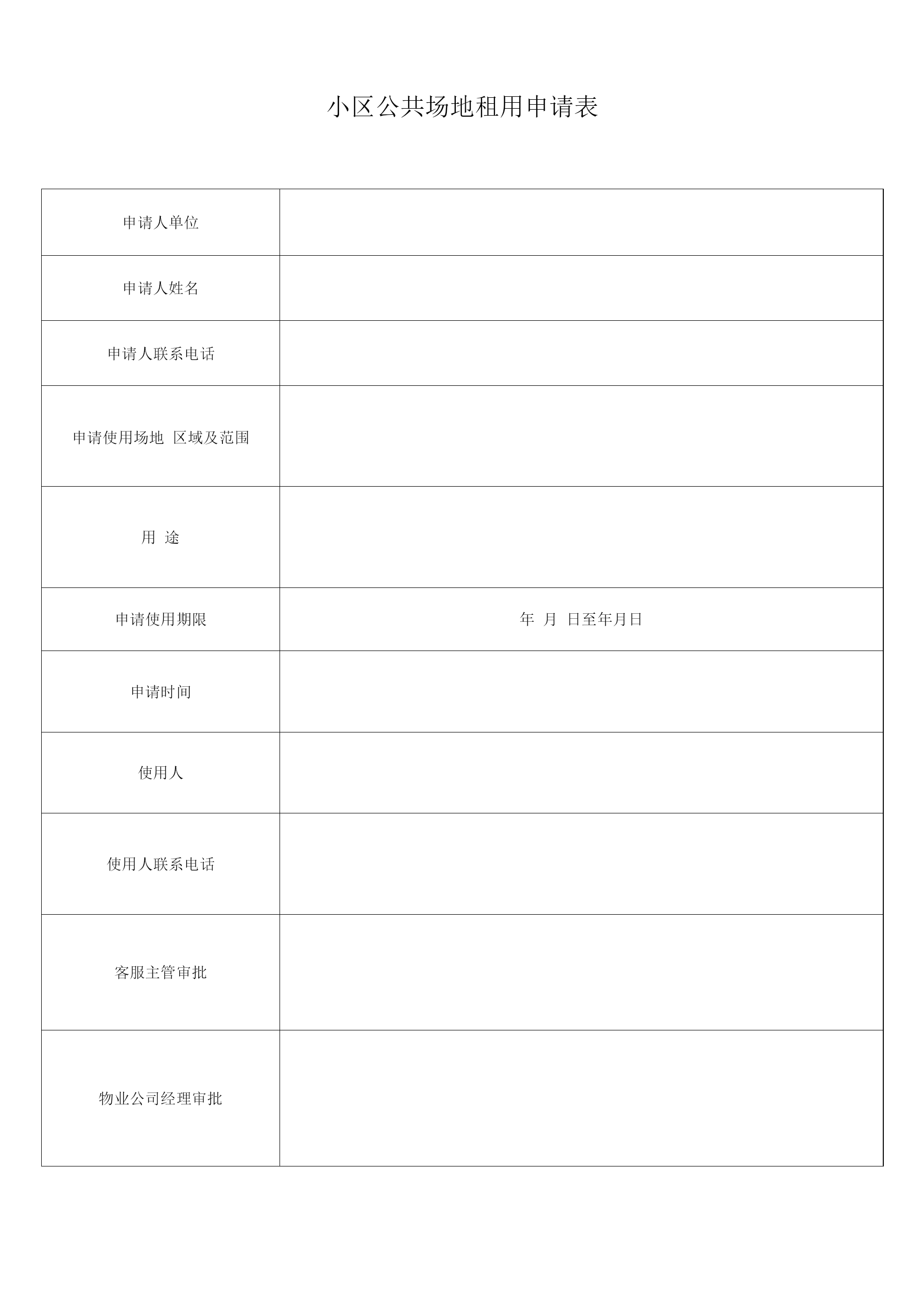 小区公共场地租用申请表申请人单位申请人姓名申请人联系电话申请使用场地区域及范围用途申请使用期限年月日至年月日申请时间使用人使用人联系电话客服主管审批物业公司经理审批