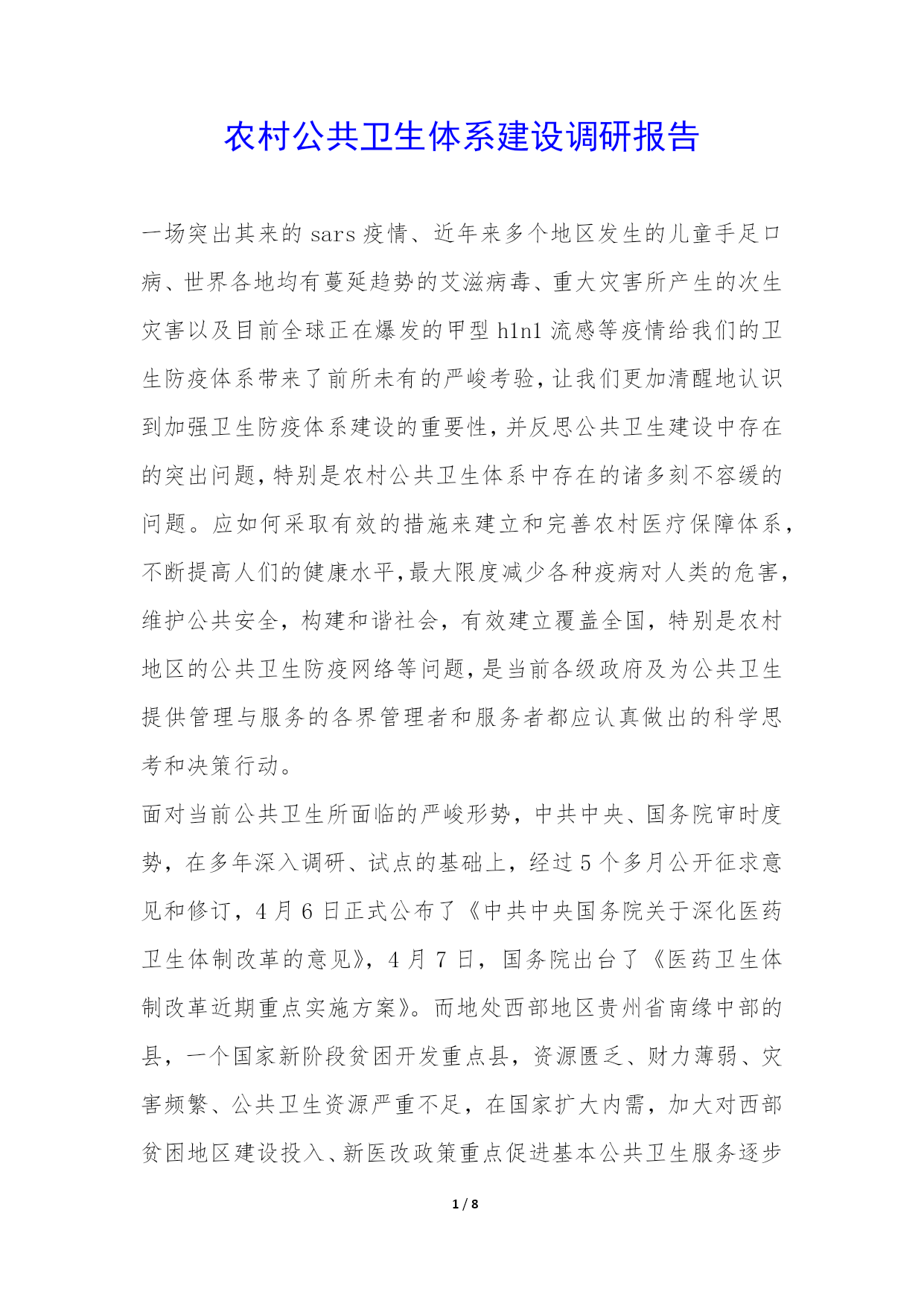 PAGE8/NUMPAGES8农村公共卫生体系建设调研报告一场突出其来的sars疫情、近年来多个地区发生的儿童手足口病、世界各地均有蔓延趋势的艾滋病毒、重大灾害所产生的次生灾害以及目前全球正在爆发的甲型h1n1流感等疫情给我们的卫生防疫体系带来了前所未有的严峻考验,让我们更加清醒地认识到加强卫生防疫体系建设的重要性,并反思公共卫生建设中存在的突出问题,特别是农村公共卫生体系中存在的诸多刻不容缓的问题。应如何采取有效的措施来建立和完善农村医疗保障体系,不断提高人们的健康水平,最大限度减少各种疫病