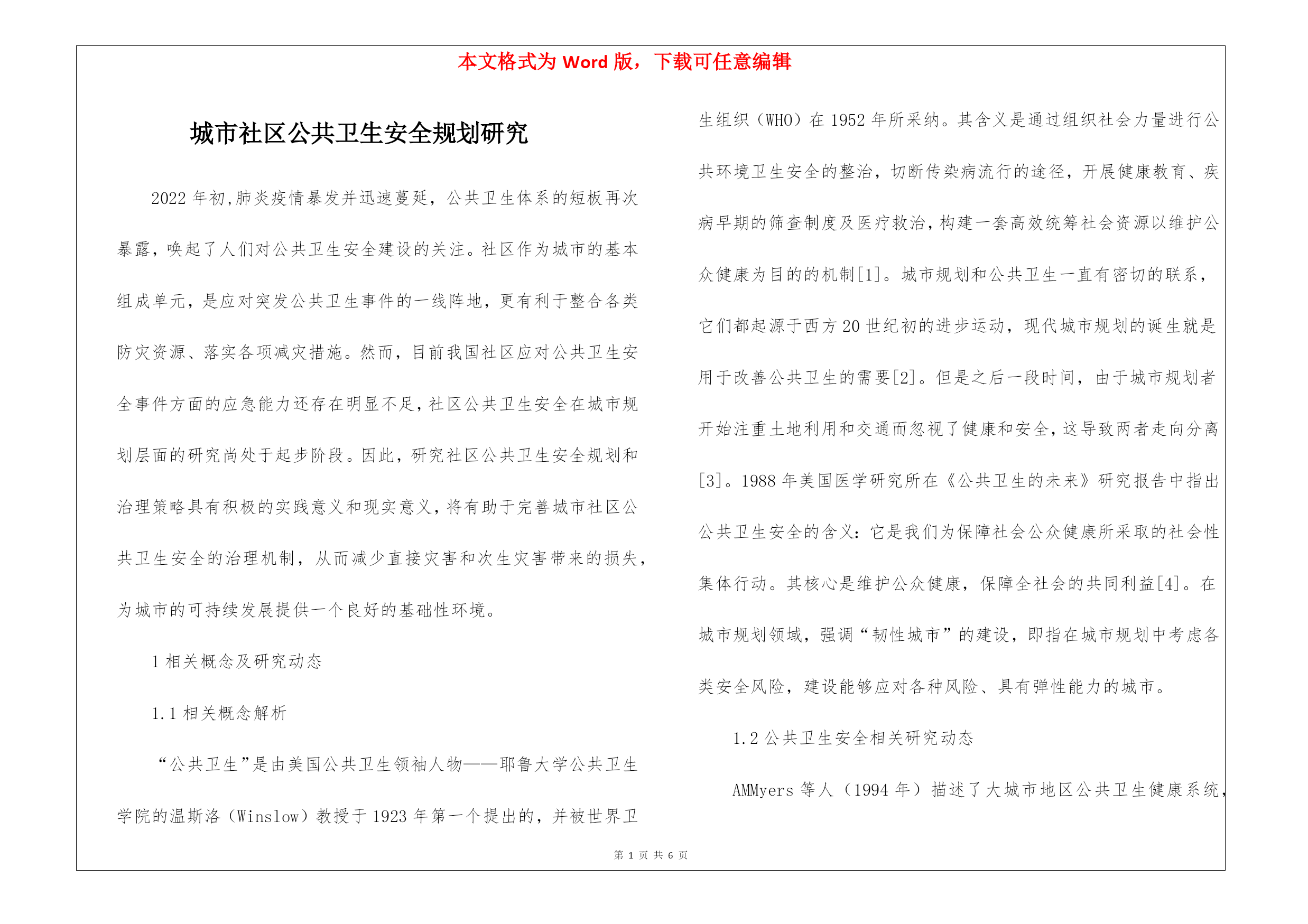 本文格式为Word版,下载可任意编辑第PAGE\*MERGEFORMAT6页共NUMPAGES\*MERGEFORMAT6页城市社区公共卫生安全规划研究2022年初,肺炎疫情暴发并迅速蔓延,公共卫生体系的短板再次暴露,唤起了人们对公共卫生安全建设的关注。社区作为城市的基本组成单元,是应对突发公共卫生事件的一线阵地,更有利于整合各类防灾资源、落实各项减灾措施。然而,目前我国社区应对公共卫生安全事件方面的应急能力还存在明显不足,社区公共卫生安全在城市规划层面的研究尚处于起步阶段。因此,研究社区公共