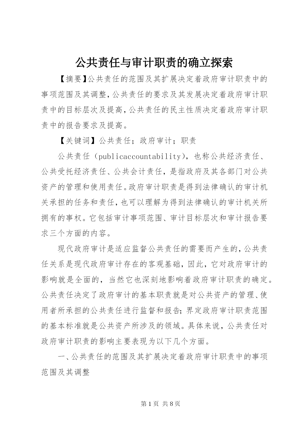 第PAGE\*Arabic\*MERGEFORMAT8页共NUMPAGES\*MERGEFORMAT8页公共责任与审计职责的确立探索【摘要】公共责任的范围及其扩展决定着政府审计职责中的事项范围及其调整,公共责任的要求及其发展决定着政府审计职责中的目标层次及提高,公共责任的民主性质决定着政府审计职责中的报告要求及提高。【关键词】公共责任;政府审计;职责公共责任(publicaccountability),也称公共经济责任、公共受托经济责任、公共会计责任,是指政府及其各部门对公共资产的管理和使用责