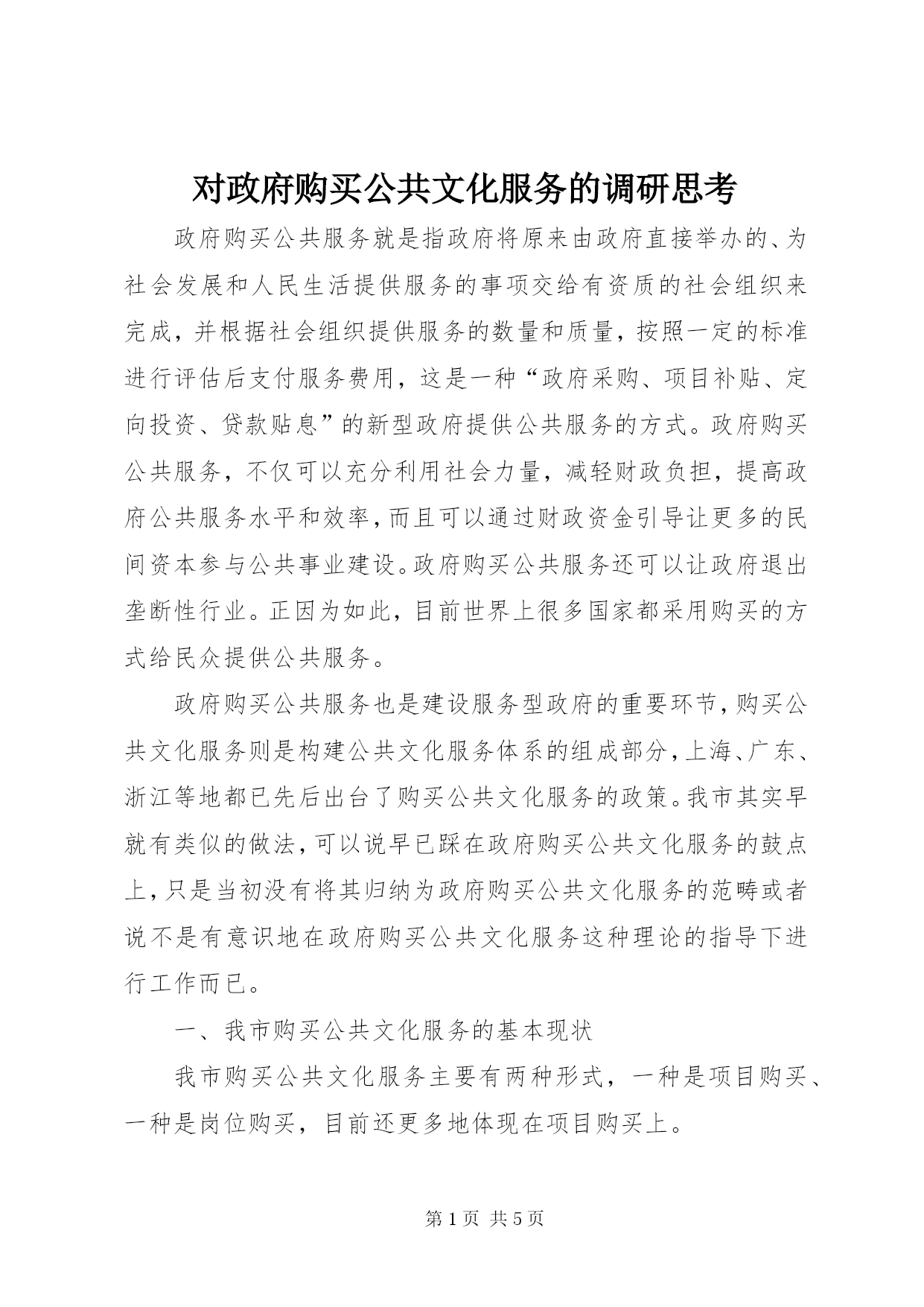 第PAGE\*Arabic\*MERGEFORMAT5页共NUMPAGES\*MERGEFORMAT5页对政府购买公共文化服务的调研思考政府购买公共服务就是指政府将原来由政府直接举办的、为社会发展和人民生活提供服务的事项交给有资质的社会组织来完成,并根据社会组织提供服务的数量和质量,按照一定的标准进行评估后支付服务费用,这是一种“政府采购、项目补贴、定向投资、贷款贴息”的新型政府提供公共服务的方式。政府购买公共服务,不仅可以充分利用社会力量,减轻财政负担,提高政府公共服务水平和效率,而且可以通