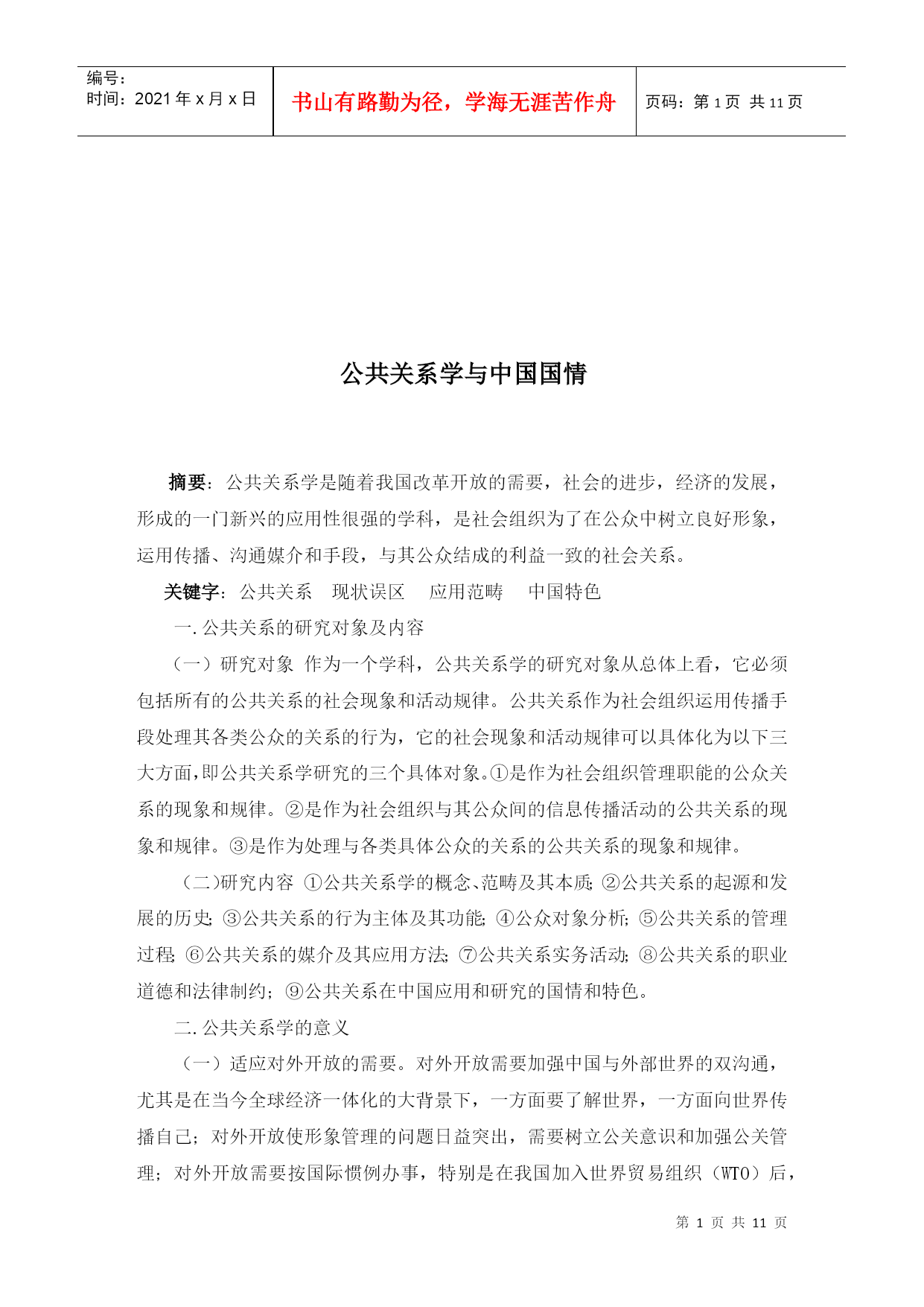 编号:时间:2021年x月x日书山有路勤为径,学海无涯苦作舟页码:第PAGE11页共NUMPAGES11页第PAGE\*MERGEFORMAT11页共NUMPAGES\*MERGEFORMAT11页HYPERLINK"xxxx/"公共关系学与中国国情摘要:公共关系学是随着我国改革开放的需要,社会的进步,经济的发展,形成的一门新兴的应用性很强的学科,是社会组织为了在公众中树立良好形象,运用传播、沟通媒介和手段,与其公众结成的利益一致的社会关系。关键字:公共关系现状误区应用范畴中