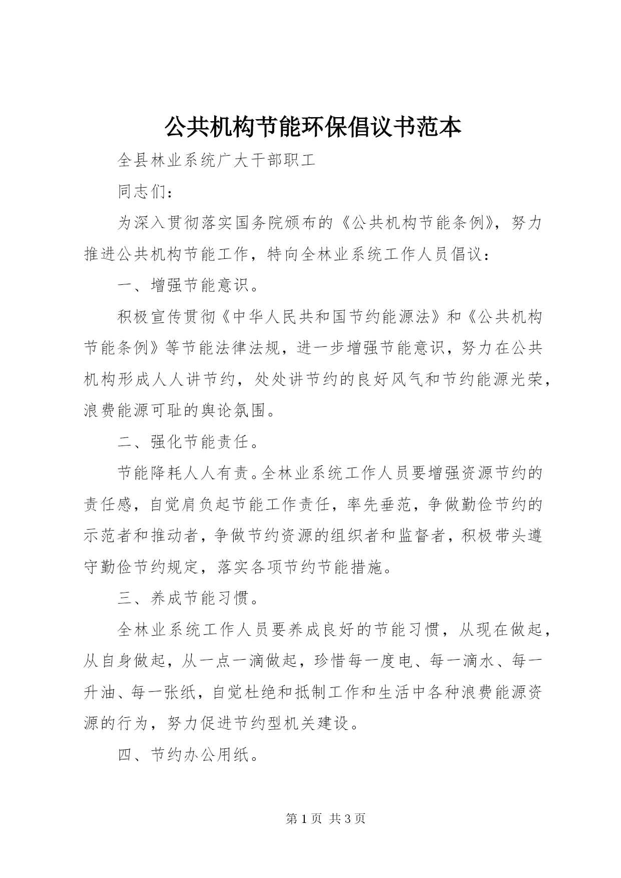 第PAGE\*Arabic\*MERGEFORMAT3页共NUMPAGES\*MERGEFORMAT3页公共机构节能环保倡议书范本全县林业系统广大干部职工同志们:为深入贯彻落实国务院颁布的《公共机构节能条例》,努力推进公共机构节能工作,特向全林业系统工作人员倡议:一、增强节能意识。积极宣传贯彻《中华人民共和国节约能源法》和《公共机构节能条例》等节能法律法规,进一步增强节能意识,努力在公共机构形成人人讲节约,处处讲节约的良好风气和节约能源光荣,浪费能源可耻的舆论氛围。二、强化节能责任。节能降耗人
