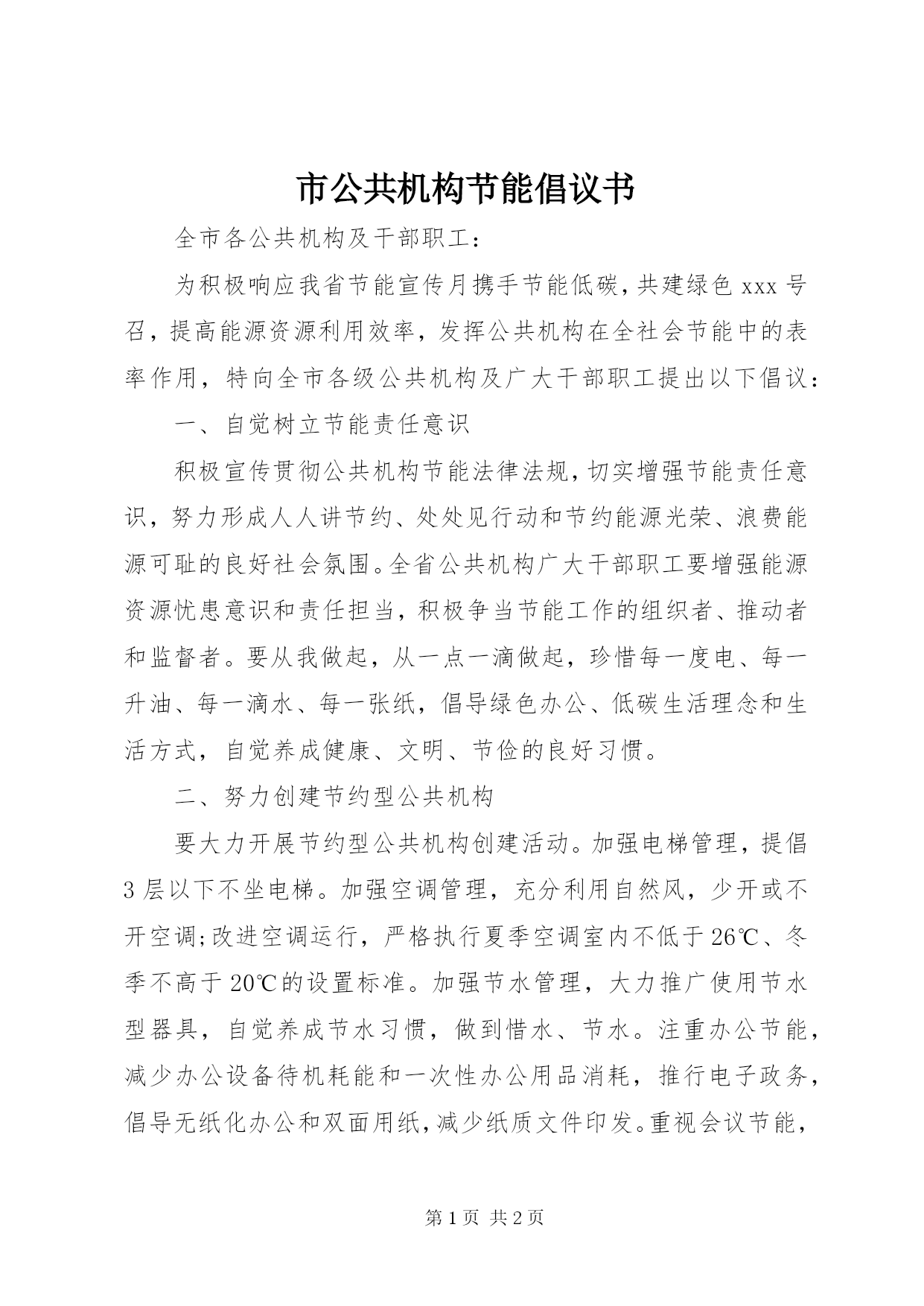 第PAGE\*Arabic\*MERGEFORMAT2页共NUMPAGES\*MERGEFORMAT2页市公共机构节能倡议书全市各公共机构及干部职工:为积极响应我省节能宣传月携手节能低碳,共建绿色xxx号召,提高能源资源利用效率,发挥公共机构在全社会节能中的表率作用,特向全市各级公共机构及广大干部职工提出以下倡议:一、自觉树立节能责任意识积极宣传贯彻公共机构节能法律法规,切实增强节能责任意识,努力形成人人讲节约、处处见行动和节约能源光荣、浪费能源可耻的良好社会氛围。全省公共机构广大干部职工要增