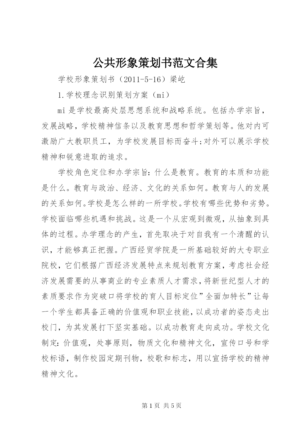 第PAGE\*Arabic\*MERGEFORMAT5页共NUMPAGES\*MERGEFORMAT5页公共形象策划书范文合集学校形象策划书(2011-5-16)梁屹1.学校理念识别策划方案(mi)mi是学校最高处层思想系统和战略系统。包括办学宗旨,发展战略,学校精神信条以及教育思想和哲学策划等。他对内可激励广大教职员工,为学校发展目标而奋斗;对外可以展示学校精神和锐意进取的追求。学校角色定位和办学宗旨:什么是教育。教育的本质和功能是什么。教育与政治、经济、文化的关系如何。教育与人的发展的关系