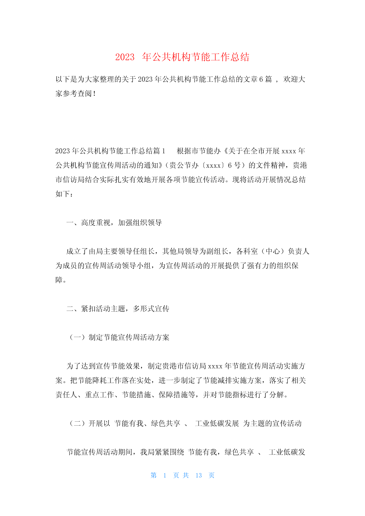 2023年公共机构节能工作总结以下是为大家整理的关于2023年公共机构节能工作总结的文章6篇,欢迎大家参考查阅!2023年公共机构节能工作总结篇1根据市节能办《关于在全市开展xxxx年公共机构节能宣传周活动的通知》(贵公节办〔xxxx〕6号)的文件精神,贵港市信访局结合实际扎实有效地开展各项节能宣传活动。现将活动开展情况总结如下:一、高度重视,加强组织领导成立了由局主要领导任组长,其他局领导为副组长,各科室(中心)负责人为成员的宣传周活动领导小组,为宣传周活动的开展提供了强有力的组织保障。二、紧扣活动主题