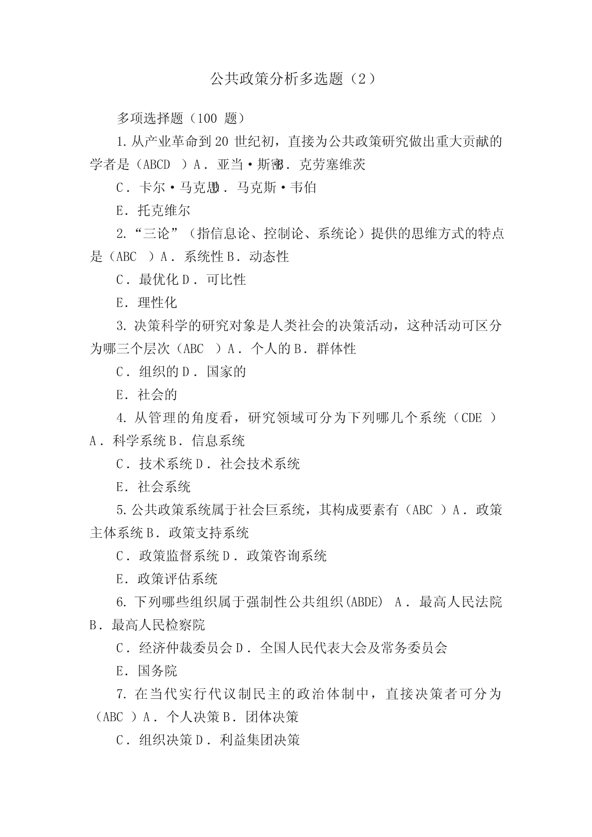 公共政策分析多选题(2)多项选择题(100题)1.从产业革命到20世纪初,直接为公共政策研究做出重大贡献的学者是(ABCD)A.亚当·斯密B.克劳塞维茨C.卡尔·马克思D.马克斯·韦伯E.托克维尔2.“三论”(指信息论、控制论、系统论)提供的思维方式的特点是(ABC)A.系统性B.动态性C.最优化D.可比性E.理性化3.决策科学的研究对象是人类社会的决策活动,这种活动可区分为哪三个层次(ABC)A.个人的B.群体性C.组织的D.国家的E.社会的4.从管理的角度看,研究领域可分为下列哪几个系统(CDE)A.
