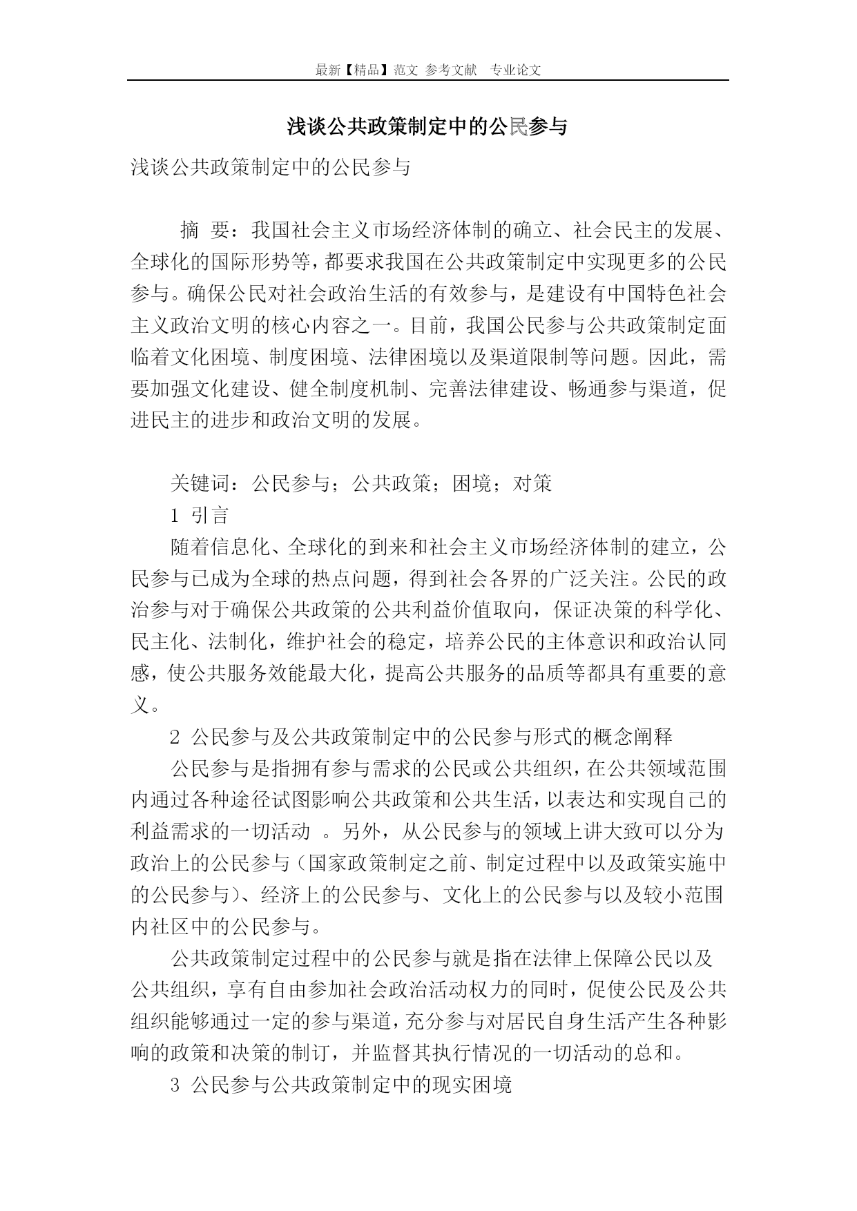 最新【精品】范文参考文献专业论文浅谈公共政策制定中的公民参与浅谈公共政策制定中的公民参与摘要:我国社会主义市场经济体制的确立、社会民主的发展、全球化的国际形势等,都要求我国在公共政策制定中实现更多的公民参与。确保公民对社会政治生活的有效参与,是建设有中国特色社会主义政治文明的核心内容之一。目前,我国公民参与公共政策制定面临着文化困境、制度困境、法律困境以及渠道限制等问题。因此,需要加强文化建设、健全制度机制、完善法律建设、畅通参与渠道,促进民主的进步和政治文明的发展。关键词:公民参与;公共政策;困境;对策