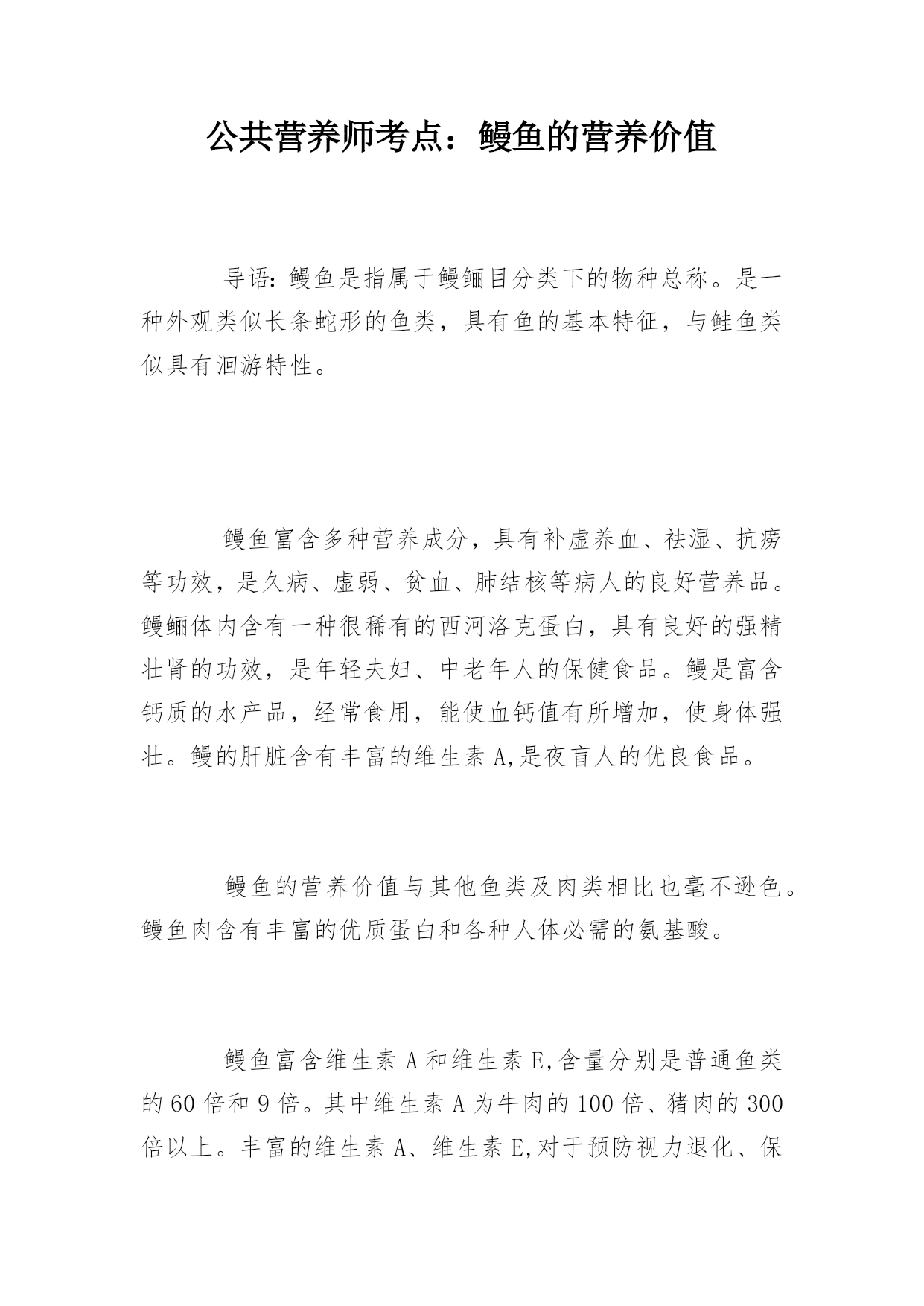公共营养师考点:鳗鱼的营养价值导语:鳗鱼是指属于鳗鲡目分类下的物种总称。是一种外观类似长条蛇形的鱼类,具有鱼的基本特征,与鲑鱼类似具有洄游特性。鳗鱼富含多种营养成分,具有补虚养血、祛湿、抗痨等功效,是久病、虚弱、贫血、肺结核等病人的良好营养品。鳗鲡体内含有一种很稀有的西河洛克蛋白,具有良好的强精壮肾的功效,是年轻夫妇、中老年人的保健食品。鳗是富含钙质的水产品,经常食用,能使血钙值有所增加,使身体强壮。鳗的肝脏含有丰富的维生素A,是夜盲人的优良食品。鳗鱼的营养价值与其他鱼类及肉类相比也毫不逊色。鳗鱼肉含有丰