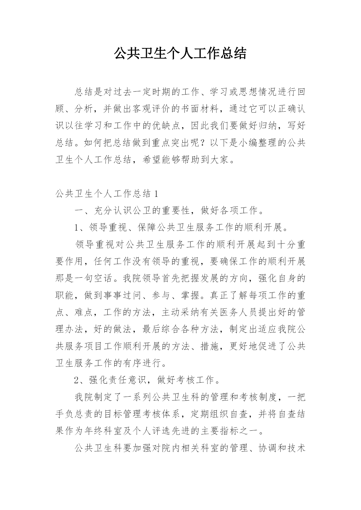 公共卫生个人工作总结总结是对过去一定时期的工作、学习或思想情况进行回顾、分析,并做出客观评价的书面材料,通过它可以正确认识以往学习和工作中的优缺点,因此我们要做好归纳,写好总结。如何把总结做到重点突出呢?以下是小编整理的公共卫生个人工作总结,希望能够帮助到大家。公共卫生个人工作总结1一、充分认识公卫的重要性,做好各项工作。1、领导重视、保障公共卫生服务工作的顺利开展。领导重视对公共卫生服务工作的顺利开展起到十分重要作用,任何工作没有领导的重视,要确保工作的顺利开展那是一句空话。我院领导首先把握发展的方向,