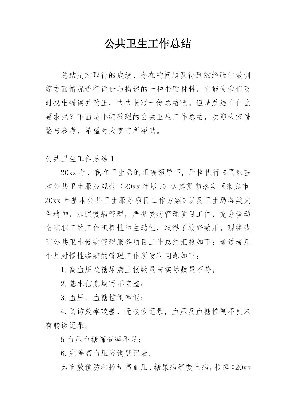 公共卫生工作总结总结是对取得的成绩、存在的问题及得到的经验和教训等方面情况进行评价与描述的一种书面材料,它能使我们及时找出错误并改正,快快来写一份总结吧。但是总结有什么要求呢?下面是小编整理的公共卫生工作总结,欢迎大家借鉴与参考,希望对大家有所帮助。公共卫生工作总结120xx年,我在卫生局的正确领导下,严格执行《国家基本公共卫生服务规范(20xx年版)》认真贯彻落实《来宾市20xx年基本公共卫生服务项目工作方案》以及卫生局各类文件精神,加强慢病管理,严抓慢病管理项目工作,充分调动全院职工的工作积极性和主动
