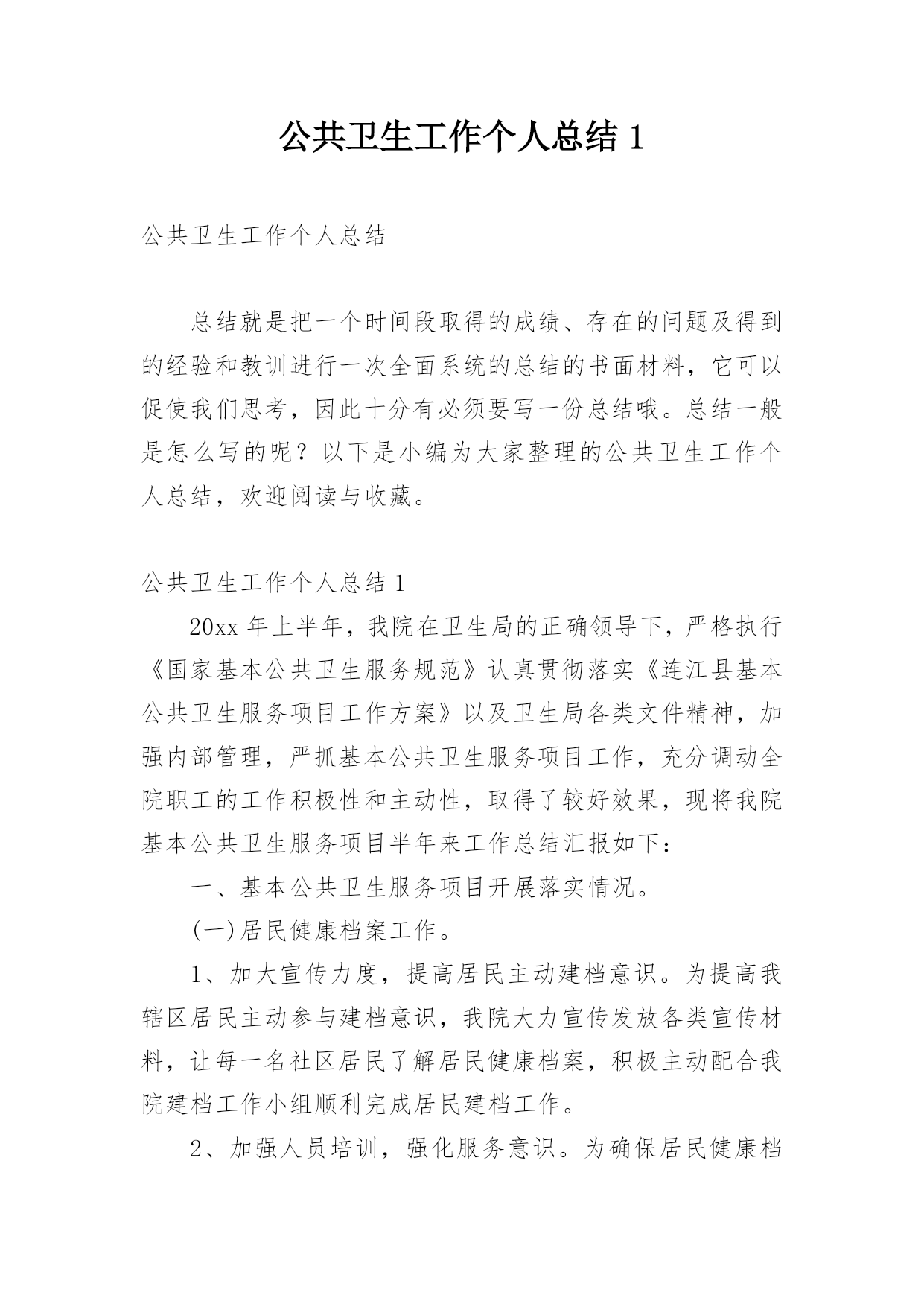 公共卫生工作个人总结1公共卫生工作个人总结总结就是把一个时间段取得的成绩、存在的问题及得到的经验和教训进行一次全面系统的总结的书面材料,它可以促使我们思考,因此十分有必须要写一份总结哦。总结一般是怎么写的呢?以下是小编为大家整理的公共卫生工作个人总结,欢迎阅读与收藏。公共卫生工作个人总结120xx年上半年,我院在卫生局的正确领导下,严格执行《国家基本公共卫生服务规范》认真贯彻落实《连江县基本公共卫生服务项目工作方案》以及卫生局各类文件精神,加强内部管理,严抓基本公共卫生服务项目工作,充分调动全院职工的工作