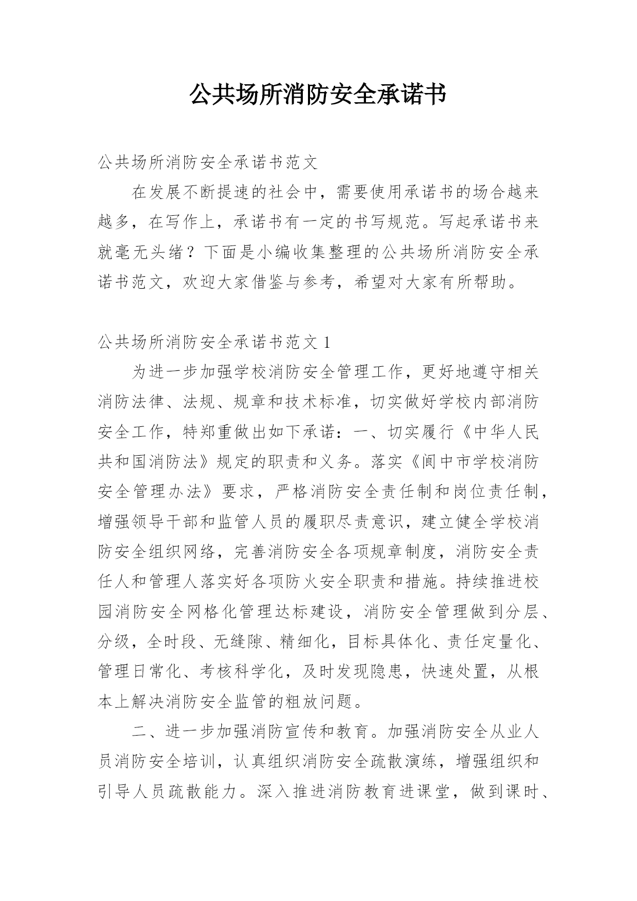 公共场所消防安全承诺书公共场所消防安全承诺书范文在发展不断提速的社会中,需要使用承诺书的场合越来越多,在写作上,承诺书有一定的书写规范。写起承诺书来就毫无头绪?下面是小编收集整理的公共场所消防安全承诺书范文,欢迎大家借鉴与参考,希望对大家有所帮助。公共场所消防安全承诺书范文1为进一步加强学校消防安全管理工作,更好地遵守相关消防法律、法规、规章和技术标准,切实做好学校内部消防安全工作,特郑重做出如下承诺:一、切实履行《中华人民共和国消防法》规定的职责和义务。落实《阆中市学校消防安全管理办法》要求,严格消防安