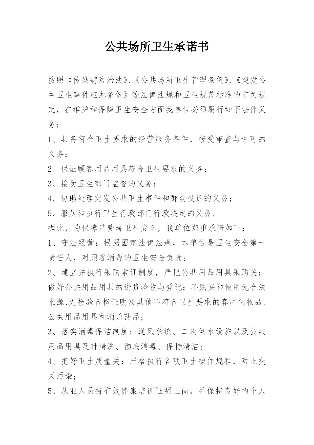 公共场所卫生承诺书按照《传染病防治法》、《公共场所卫生管理条例》、《突发公共卫生事件应急条例》等法律法规和卫生规范标准的有关规定,在维护和保障卫生安全方面我单位必须履行如下法律义务:1、具备符合卫生要求的经营服务条件,接受审查与许可的义务;2、保证顾客用品用具符合卫生要求的义务;3、接受卫生部门监督的义务;4、协助处理突发公共卫生事件和群众投诉的义务;5、服从和执行卫生行政部门行政决定的义务。据此,为保障消费者卫生安全,我单位郑重承诺如下:1、守法经营:根据国家法律法规,本单位是卫生安全第一责任人,对顾客