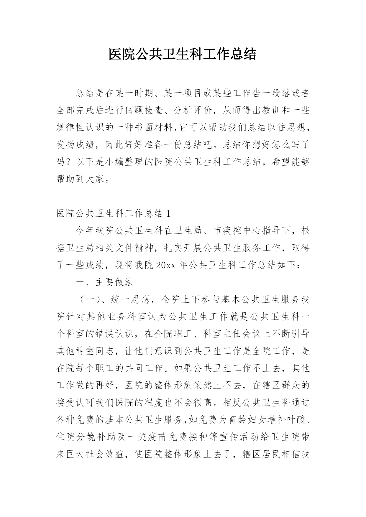 医院公共卫生科工作总结总结是在某一时期、某一项目或某些工作告一段落或者全部完成后进行回顾检查、分析评价,从而得出教训和一些规律性认识的一种书面材料,它可以帮助我们总结以往思想,发扬成绩,因此好好准备一份总结吧。总结你想好怎么写了吗?以下是小编整理的医院公共卫生科工作总结,希望能够帮助到大家。医院公共卫生科工作总结1今年我院公共卫生科在卫生局、市疾控中心指导下,根据卫生局相关文件精神,扎实开展公共卫生服务工作,取得了一些成绩,现将我院20xx年公共卫生科工作总结如下:一、主要做法(一)、统一思想,全院上下参