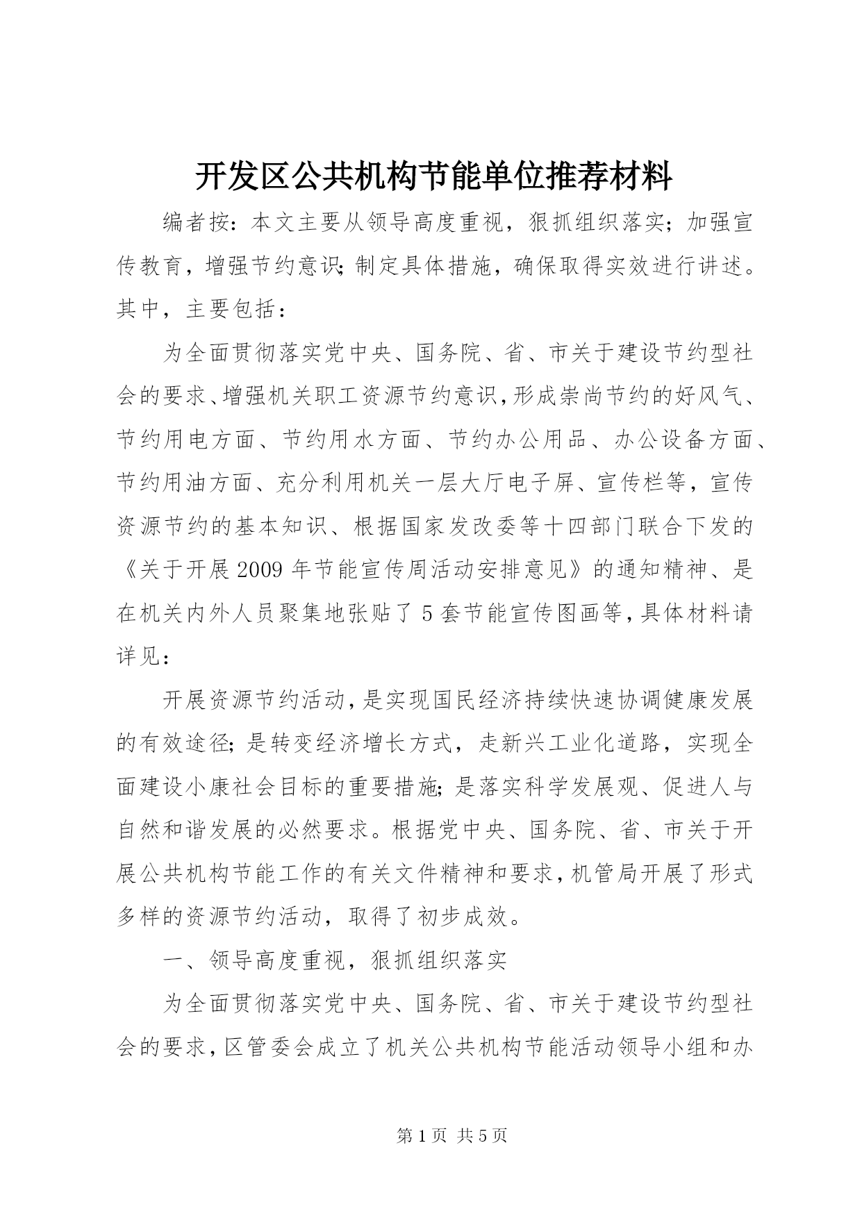 第PAGE\*Arabic\*MERGEFORMAT5页共NUMPAGES\*MERGEFORMAT5页开发区公共机构节能单位推荐材料编者按:本文主要从领导高度重视,狠抓组织落实;加强宣传教育,增强节约意识;制定具体措施,确保取得实效进行讲述。其中,主要包括:为全面贯彻落实党中央、国务院、省、市关于建设节约型社会的要求、增强机关职工资源节约意识,形成崇尚节约的好风气、节约用电方面、节约用水方面、节约办公用品、办公设备方面、节约用油方面、充分利用机关一层大厅电子屏、宣传栏等,宣传资源节约的基本知