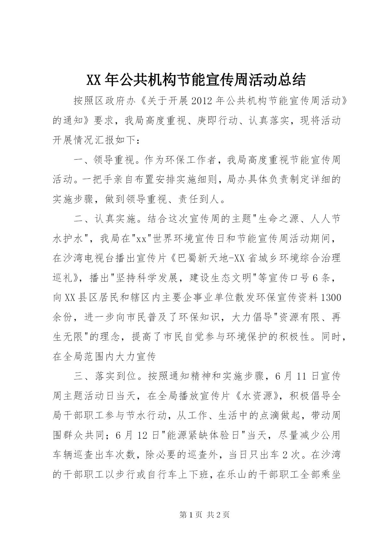第PAGE\*Arabic\*MERGEFORMAT2页共NUMPAGES\*MERGEFORMAT2页XX年公共机构节能宣传周活动总结按照区政府办《关于开展2012年公共机构节能宣传周活动》的通知》要求,我局高度重视、庚即行动、认真落实,现将活动开展情况汇报如下:一、领导重视。作为环保工作者,我局高度重视节能宣传周活动。一把手亲自布置安排实施细则,局办具体负责制定详细的实施步骤,做到领导重视、责任到人。二、认真实施。结合这次宣传周的主题"生命之源、人人节水护水",我局在"xx"世界环境宣传日