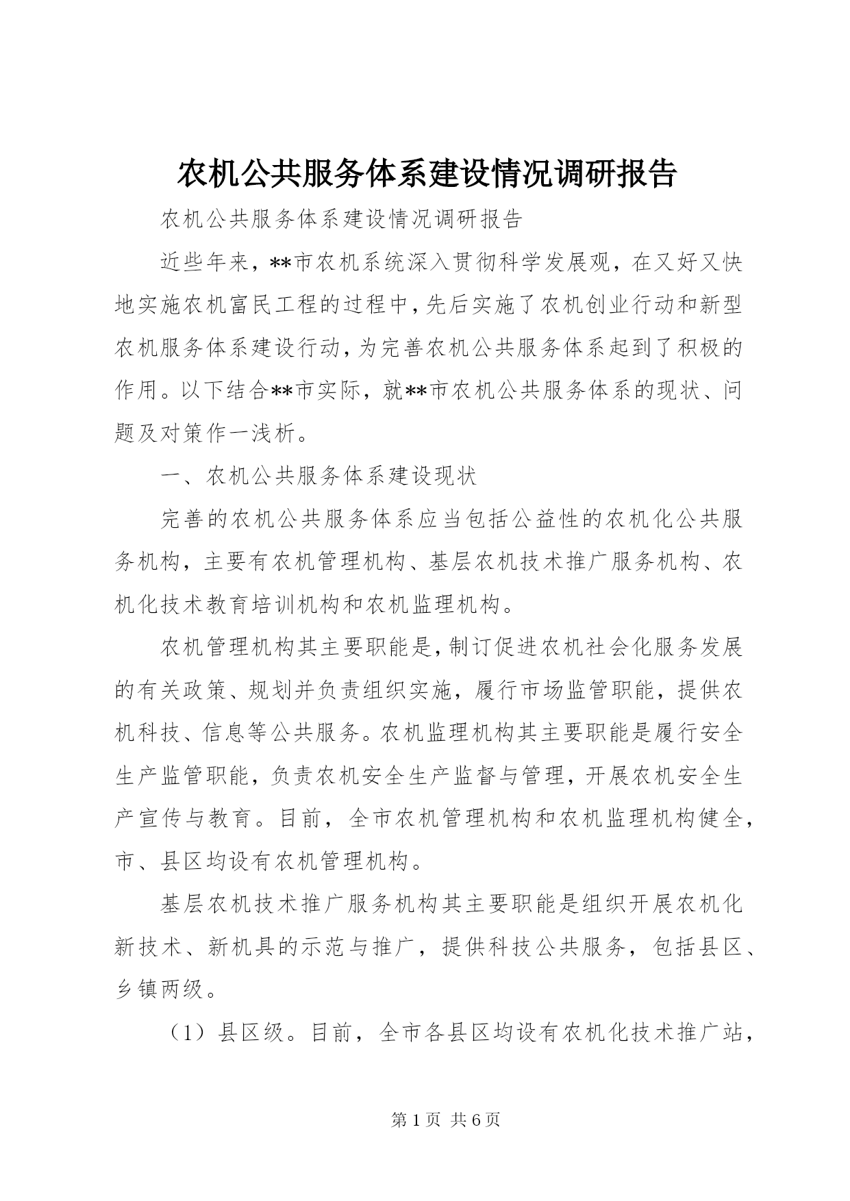 第PAGE\*Arabic\*MERGEFORMAT6页共NUMPAGES\*MERGEFORMAT6页农机公共服务体系建设情况调研报告农机公共服务体系建设情况调研报告近些年来,**市农机系统深入贯彻科学发展观,在又好又快地实施农机富民工程的过程中,先后实施了农机创业行动和新型农机服务体系建设行动,为完善农机公共服务体系起到了积极的作用。以下结合**市实际,就**市农机公共服务体系的现状、问题及对策作一浅析。一、农机公共服务体系建设现状完善的农机公共服务体系应当包括公益性的农机化公共服务机构,