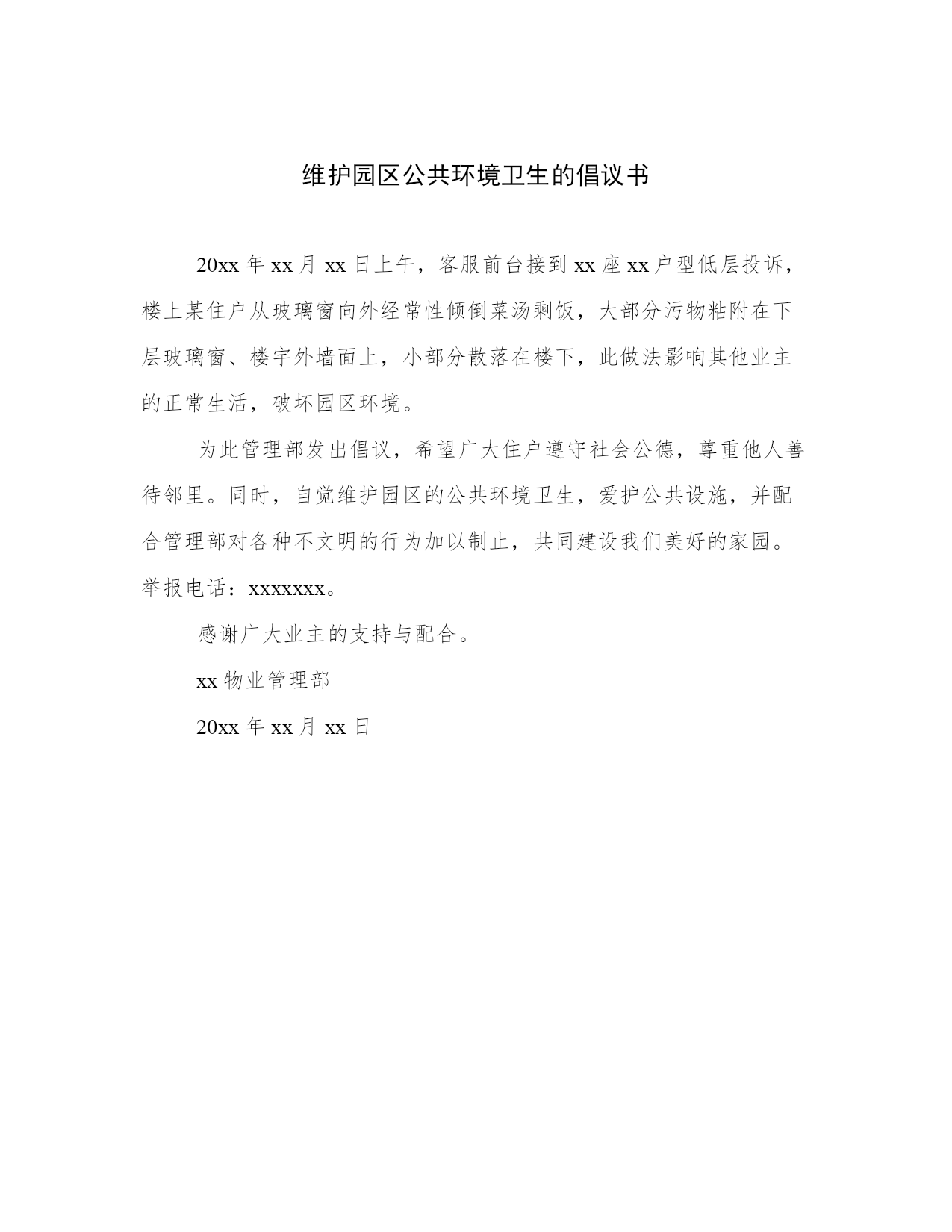 维护园区公共环境卫生的倡议书20xx年xx月xx日上午,客服前台接到xx座xx户型低层投诉,楼上某住户从玻璃窗向外经常性倾倒菜汤剩饭,大部分污物粘附在下层玻璃窗、楼宇外墙面上,小部分散落在楼下,此做法影响其他业主的正常生活,破坏园区环境。为此管理部发出倡议,希望广大住户遵守社会公德,尊重他人善待邻里。同时,自觉维护园区的公共环境卫生,爱护公共设施,并配合管理部对各种不文明的行为加以制止,共同建设我们美好的家园。举报电话:xxxxxxx。感谢广大业主的支持与配合。xx物业管理部20xx年xx月xx日