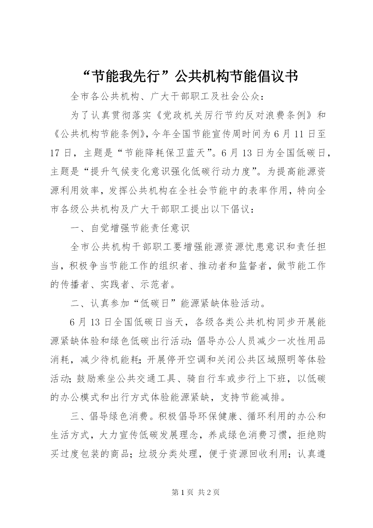 第PAGE\*Arabic\*MERGEFORMAT2页共NUMPAGES\*MERGEFORMAT2页“节能我先行”公共机构节能倡议书全市各公共机构、广大干部职工及社会公众:为了认真贯彻落实《党政机关厉行节约反对浪费条例》和《公共机构节能条例》,今年全国节能宣传周时间为6月11日至17日,主题是“节能降耗保卫蓝天”。6月13日为全国低碳日,主题是“提升气候变化意识强化低碳行动力度”。为提高能源资源利用效率,发挥公共机构在全社会节能中的表率作用,特向全市各级公共机构及广大干部职工提出以下倡议: