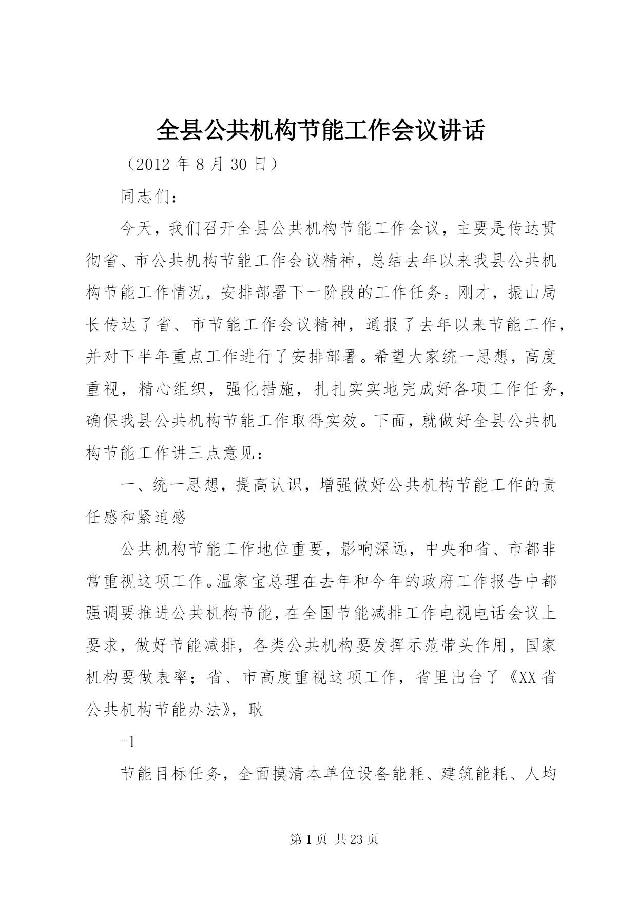 第PAGE\*Arabic\*MERGEFORMAT23页共NUMPAGES\*MERGEFORMAT23页全县公共机构节能工作会议讲话(2012年8月30日)同志们:今天,我们召开全县公共机构节能工作会议,主要是传达贯彻省、市公共机构节能工作会议精神,总结去年以来我县公共机构节能工作情况,安排部署下一阶段的工作任务。刚才,振山局长传达了省、市节能工作会议精神,通报了去年以来节能工作,并对下半年重点工作进行了安排部署。希望大家统一思想,高度重视,精心组织,强化措施,扎扎实实地完成好各项工作任务