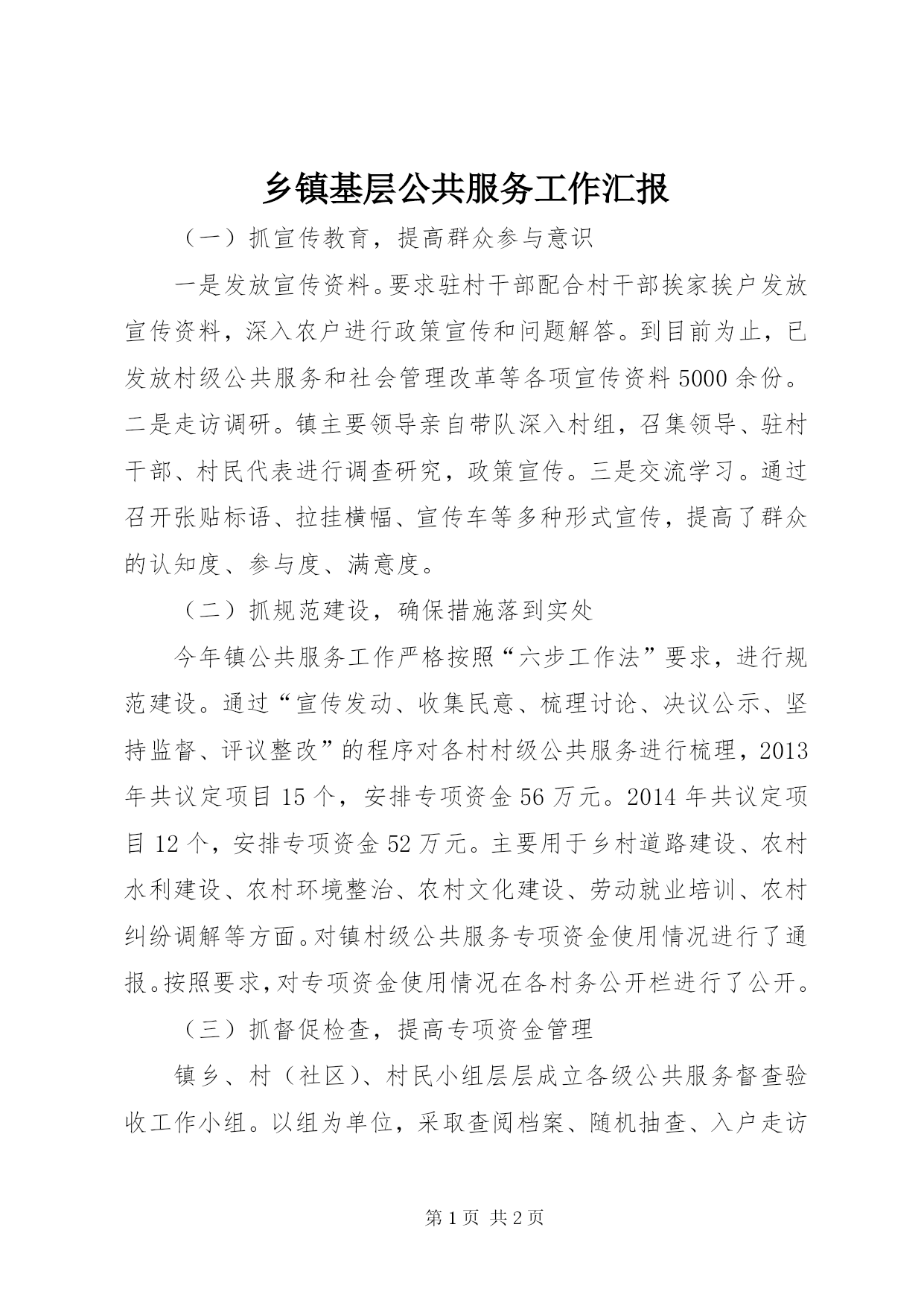 第PAGE\*Arabic\*MERGEFORMAT2页共NUMPAGES\*MERGEFORMAT2页乡镇基层公共服务工作汇报(一)抓宣传教育,提高群众参与意识一是发放宣传资料。要求驻村干部配合村干部挨家挨户发放宣传资料,深入农户进行政策宣传和问题解答。到目前为止,已发放村级公共服务和社会管理改革等各项宣传资料5000余份。二是走访调研。镇主要领导亲自带队深入村组,召集领导、驻村干部、村民代表进行调查研究,政策宣传。三是交流学习。通过召开张贴标语、拉挂横幅、宣传车等多种形式宣传,提高了群众的