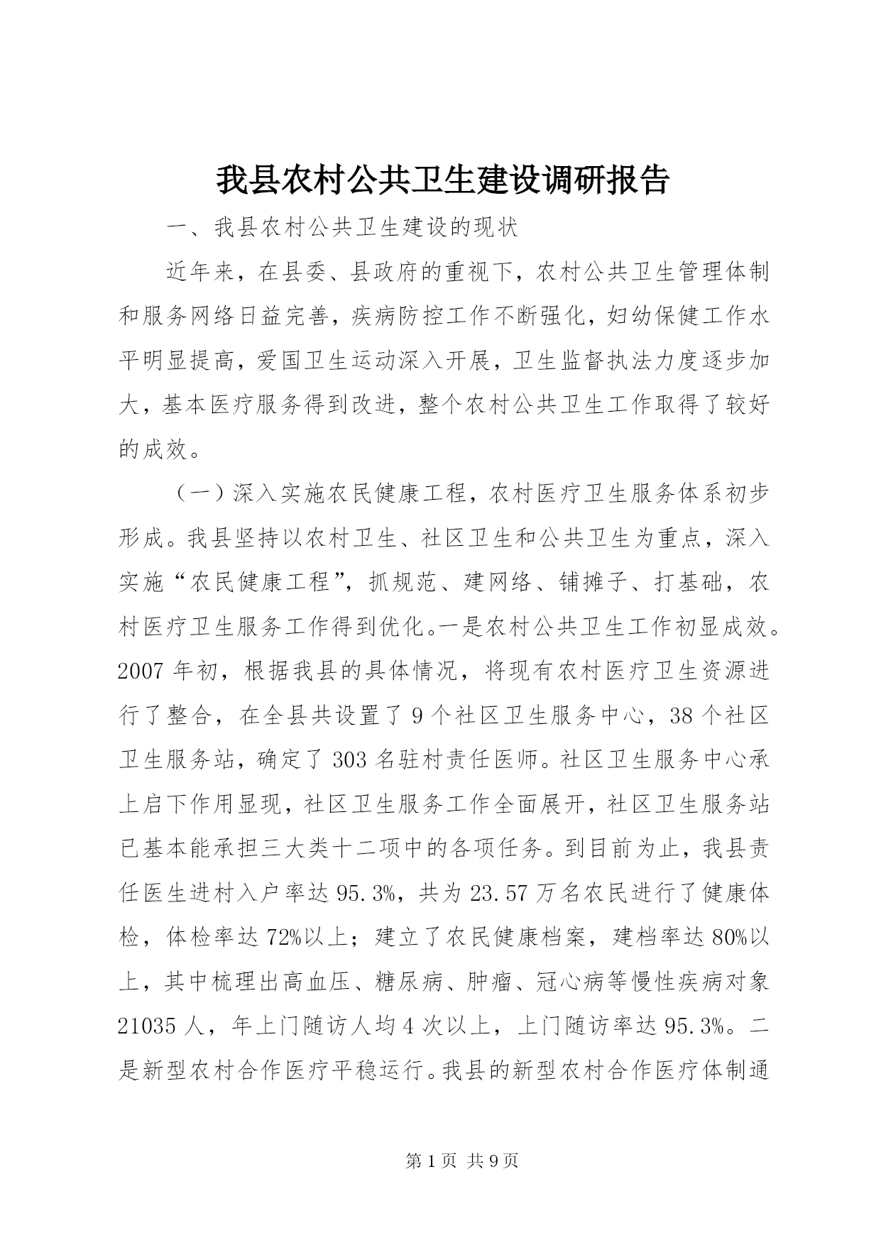 第PAGE\*Arabic\*MERGEFORMAT9页共NUMPAGES\*MERGEFORMAT9页我县农村公共卫生建设调研报告一、我县农村公共卫生建设的现状近年来,在县委、县政府的重视下,农村公共卫生管理体制和服务网络日益完善,疾病防控工作不断强化,妇幼保健工作水平明显提高,爱国卫生运动深入开展,卫生监督执法力度逐步加大,基本医疗服务得到改进,整个农村公共卫生工作取得了较好的成效。(一)深入实施农民健康工程,农村医疗卫生服务体系初步形成。我县坚持以农村卫生、社区卫生和公共卫生为重点,深入