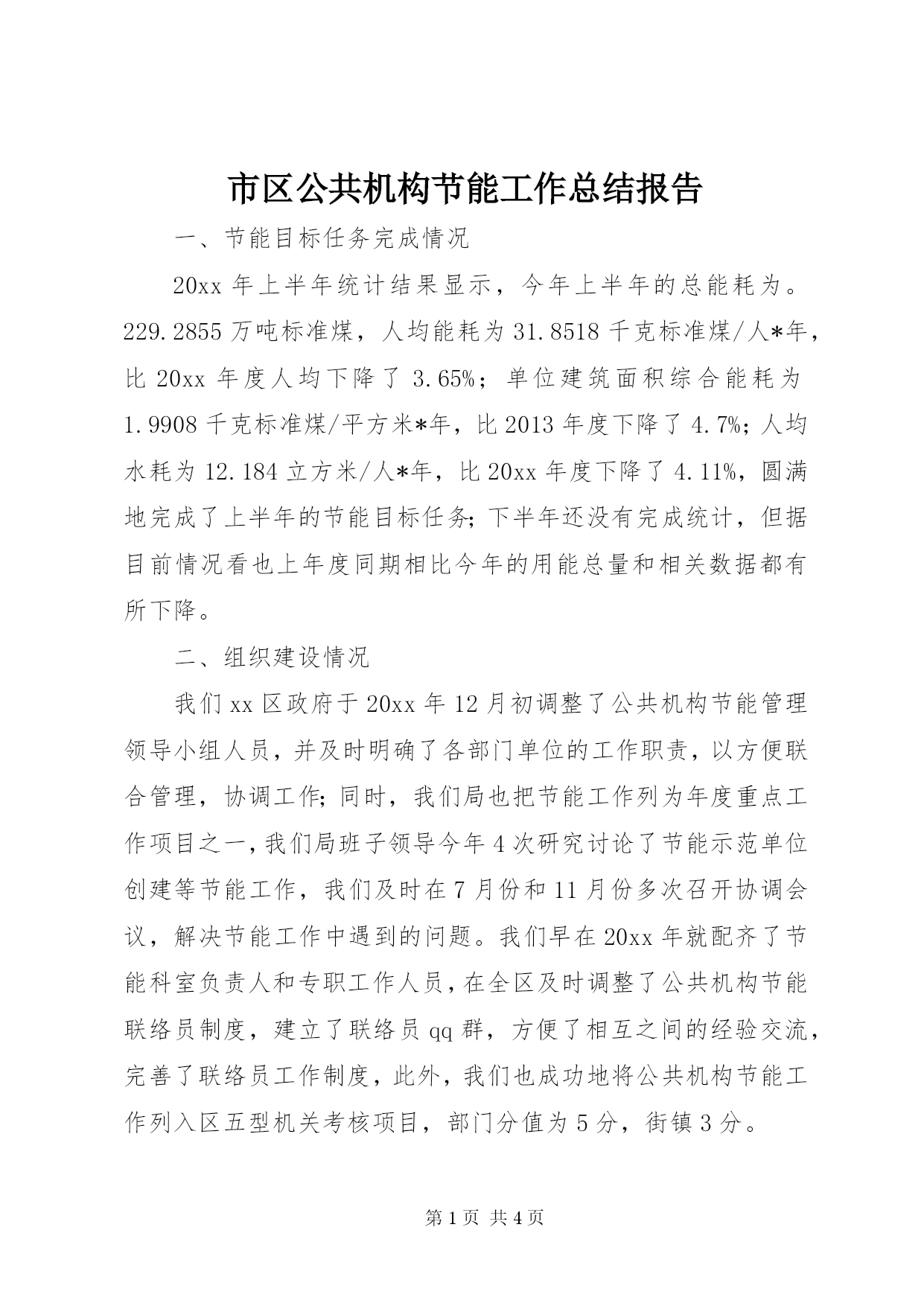 第PAGE\*Arabic\*MERGEFORMAT4页共NUMPAGES\*MERGEFORMAT4页市区公共机构节能工作总结报告一、节能目标任务完成情况20xx年上半年统计结果显示,今年上半年的总能耗为。229.2855万吨标准煤,人均能耗为31.8518千克标准煤/人*年,比20xx年度人均下降了3.65%;单位建筑面积综合能耗为1.9908千克标准煤/平方米*年,比2013年度下降了4.7%;人均水耗为12.184立方米/人*年,比20xx年度下降了4.11%,圆满地完成了上半年的节能