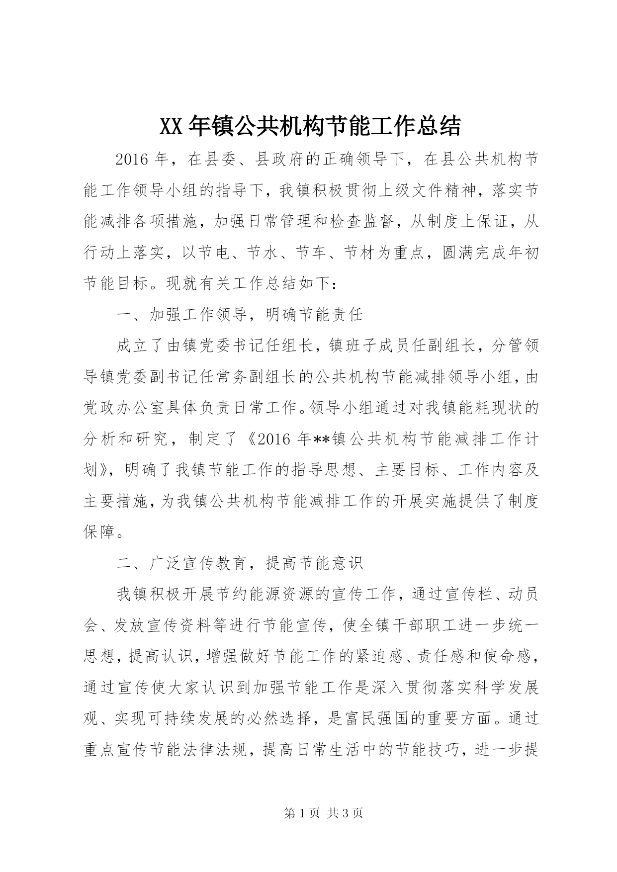 第PAGE\*Arabic\*MERGEFORMAT3页共NUMPAGES\*MERGEFORMAT3页XX年镇公共机构节能工作总结2016年,在县委、县政府的正确领导下,在县公共机构节能工作领导小组的指导下,我镇积极贯彻上级文件精神,落实节能减排各项措施,加强日常管理和检查监督,从制度上保证,从行动上落实,以节电、节水、节车、节材为重点,圆满完成年初节能目标。现就有关工作总结如下:一、加强工作领导,明确节能责任成立了由镇党委书记任组长,镇班子成员任副组长,分管领导镇党委副书记任常务副组长的公