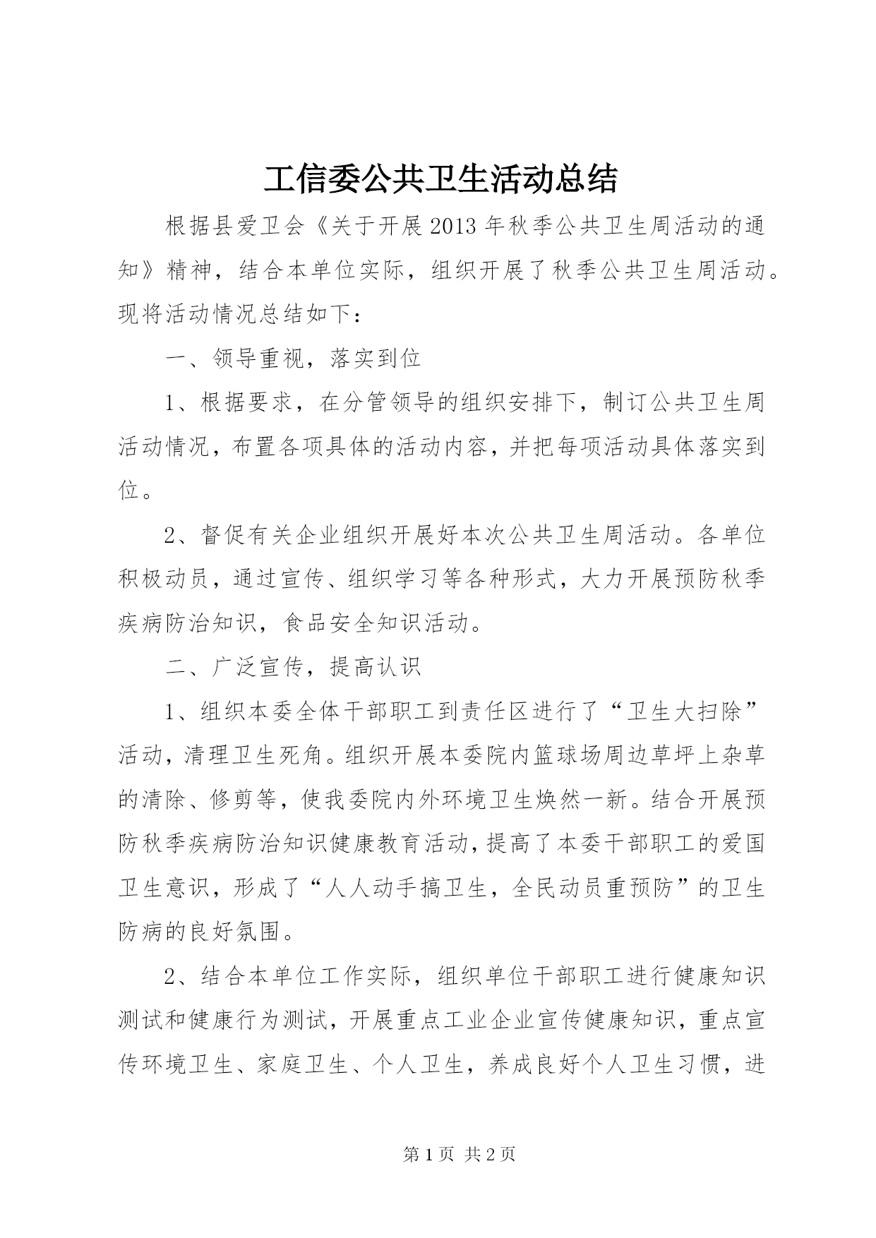 第PAGE\*Arabic\*MERGEFORMAT2页共NUMPAGES\*MERGEFORMAT2页工信委公共卫生活动总结根据县爱卫会《关于开展2013年秋季公共卫生周活动的通知》精神,结合本单位实际,组织开展了秋季公共卫生周活动。现将活动情况总结如下:一、领导重视,落实到位1、根据要求,在分管领导的组织安排下,制订公共卫生周活动情况,布置各项具体的活动内容,并把每项活动具体落实到位。2、督促有关企业组织开展好本次公共卫生周活动。各单位积极动员,通过宣传、组织学习等各种形式,大力开展预防秋