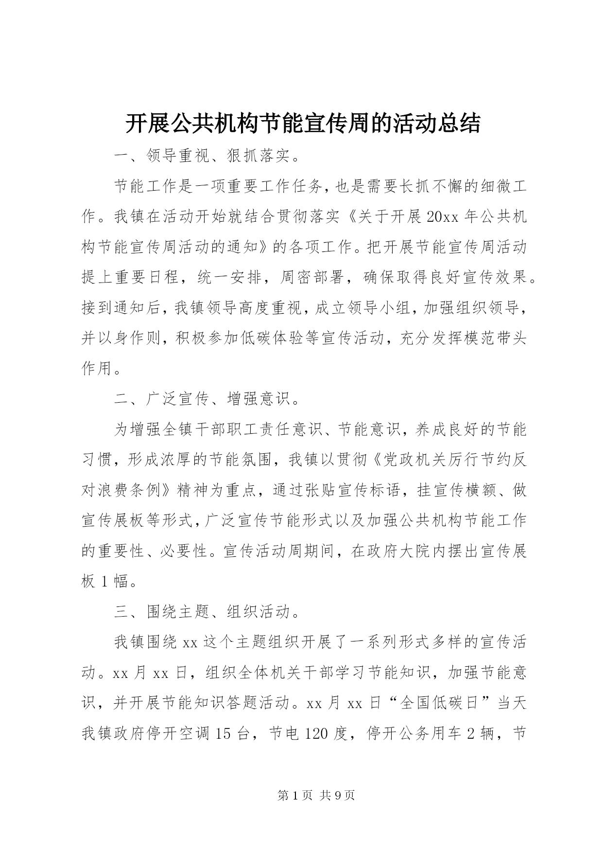 第PAGE\*Arabic\*MERGEFORMAT9页共NUMPAGES\*MERGEFORMAT9页开展公共机构节能宣传周的活动总结一、领导重视、狠抓落实。节能工作是一项重要工作任务,也是需要长抓不懈的细微工作。我镇在活动开始就结合贯彻落实《关于开展20xx年公共机构节能宣传周活动的通知》的各项工作。把开展节能宣传周活动提上重要日程,统一安排,周密部署,确保取得良好宣传效果。接到通知后,我镇领导高度重视,成立领导小组,加强组织领导,并以身作则,积极参加低碳体验等宣传活动,充分发挥模范带头作
