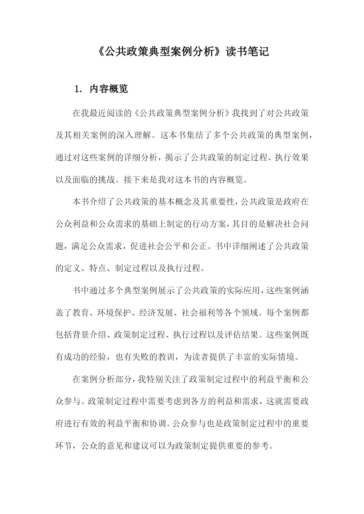 《公共政策典型案例分析》读书笔记1.内容概览在我最近阅读的《公共政策典型案例分析》我找到了对公共政策及其相关案例的深入理解。这本书集结了多个公共政策的典型案例,通过对这些案例的详细分析,揭示了公共政策的制定过程、执行效果以及面临的挑战。接下来是我对这本书的内容概览。本书介绍了公共政策的基本概念及其重要性,公共政策是政府在公众利益和公众需求的基础上制定的行动方案,其目的是解决社会问题,满足公众需求,促进社会公平和公正。书中详细阐述了公共政策的定义、特点、制定过程以及执行过程。书中通过多个典型案例展示了公共政