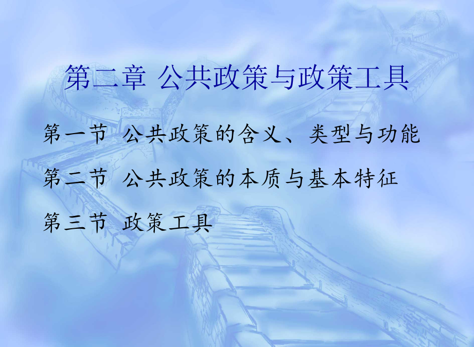 第二章公共政策与政策工具第一节公共政策的含义、类型与功能关于公共政策内涵的几点理解★二、公共政策的产生与发展(二)公共政策的发展三、政策类型:从内容特征上划分★(一)元政策、基本政策、部门政策★元政策的三种类型2.基本政策3.部门政策(二)战略、策略、战术★1.战略所谓战略就是政策主体在一个较长的时间阶段上所要达到的主导全局的根本目标以及为目标的实现所作的资源配置和行动步骤的设想。eg:毛泽东《在省市自治区党委书记会议上的讲话》:“调动一切积极力量,为了建设社会主义。这是一个战略方针。2.策略策略是政策主