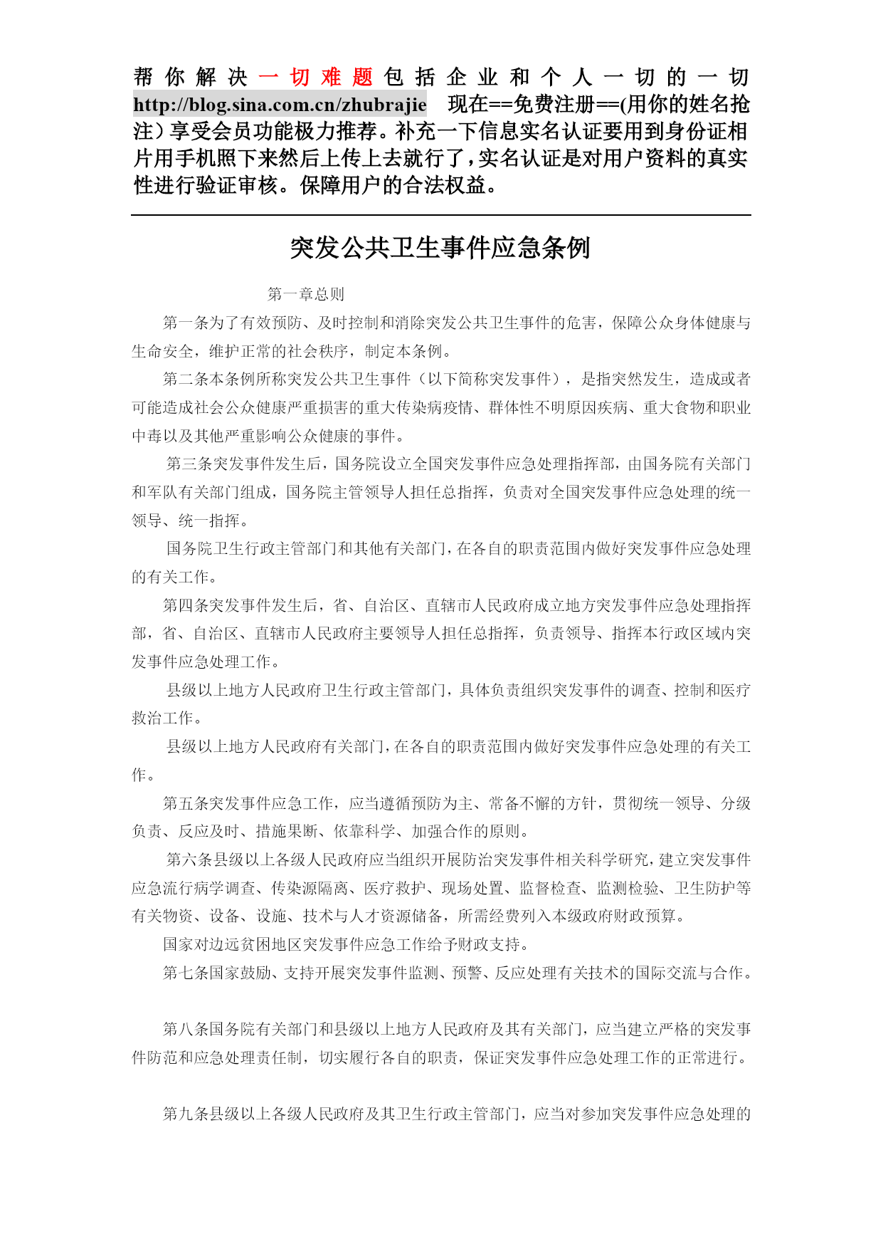 帮你解决一切难题包括企业和个人一切的一切http://blog.sina.com.cn/zhubrajie现在==免费注册==(用你的姓名抢注)享受会员功能极力推荐。补充一下信息实名认证要用到身份证相片用手机照下来然后上传上去就行了,实名认证是对用户资料的真实性进行验证审核。保障用户的合法权益。突发公共卫生事件应急条例第一章总则第一条为了有效预防、及时控制和消除突发公共卫生事件的危害,保障公众身体健康与生命安全,维护正常的社会秩序,制定本条例。第二条本条例所称突发公共卫生事件(以下简称突发事件),是指突然