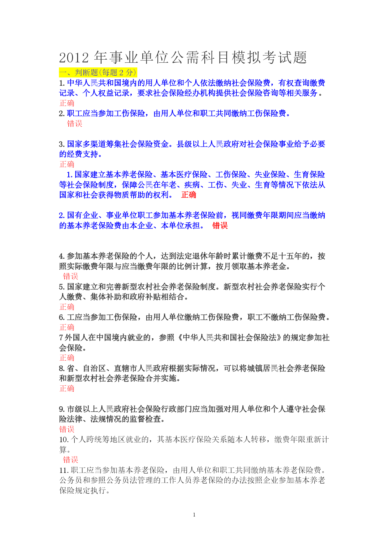 PAGEPAGE442012年事业单位公需科目模拟考试题一、判断题(每题2分)1.中华人民共和国境内的用人单位和个人依法缴纳社会保险费,有权查询缴费记录、个人权益记录,要求社会保险经办机构提供社会保险咨询等相关服务。正确2.职工应当参加工伤保险,由用人单位和职工共同缴纳工伤保险费。错误3.国家多渠道筹集社会保险资金。县级以上人民政府对社会保险事业给予必要的经费支持。正确1.国家建立基本养老保险、基本医疗保险、工伤保险、失业保险、生育保险等社会保险制度,保障公民在年老、疾病、工伤、失业、生育等情