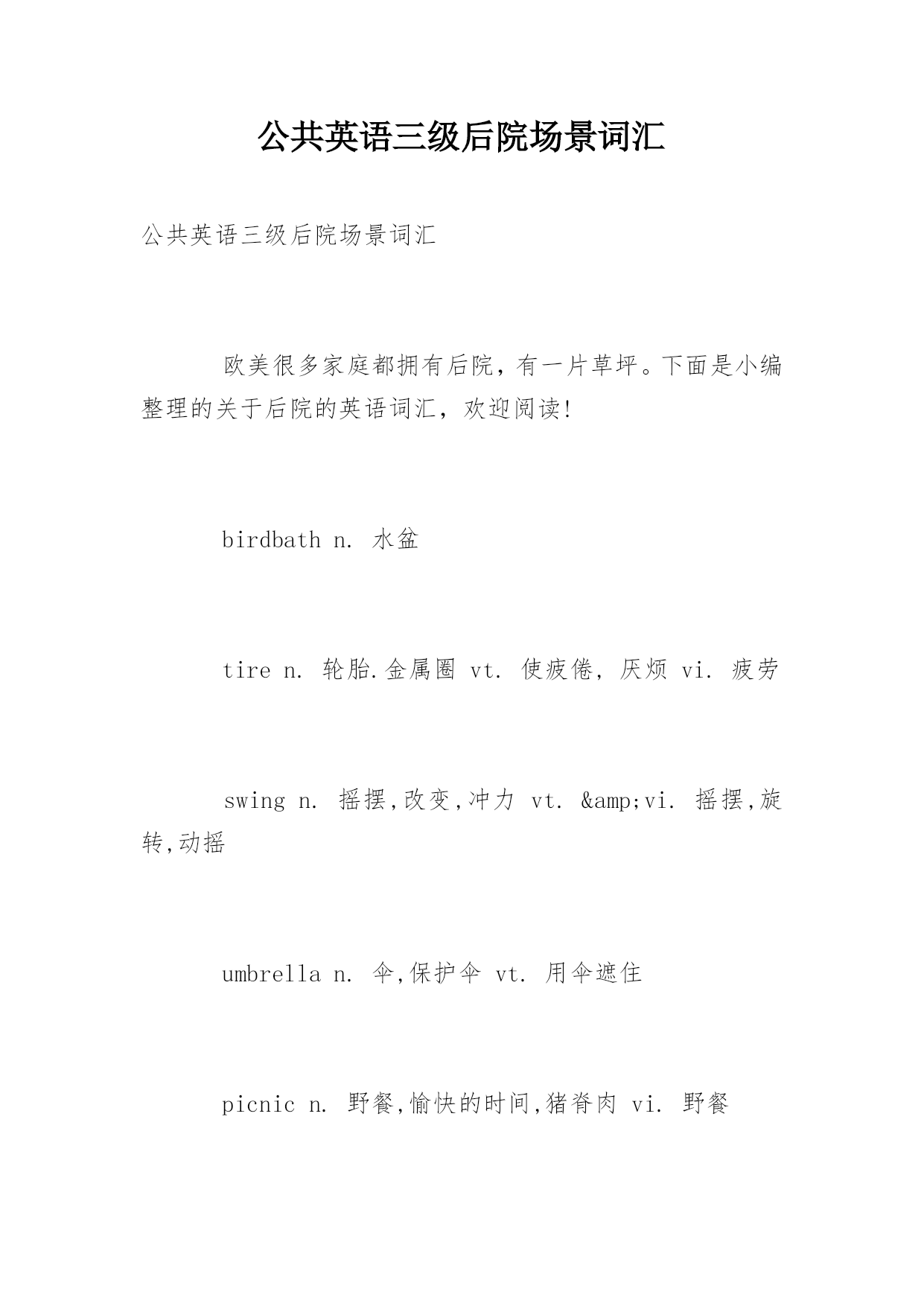 公共英语三级后院场景词汇公共英语三级后院场景词汇欧美很多家庭都拥有后院,有一片草坪。下面是小编整理的关于后院的英语词汇,欢迎阅读!birdbathn.水盆tiren.轮胎.金属圈vt.使疲倦,厌烦vi.疲劳swingn.摇摆,改变,冲力vt.&vi.摇摆,旋转,动摇umbrellan.伞,保护伞vt.用伞遮住picnicn.野餐,愉快的时间,猪脊肉vi.野餐barbequen.(=barbecue)烤肉野餐,烤肉架v.烤肉,用调料烤(肉)grilln.烤架,铁格子,烤肉vt.烧,烤,严加盘问tre