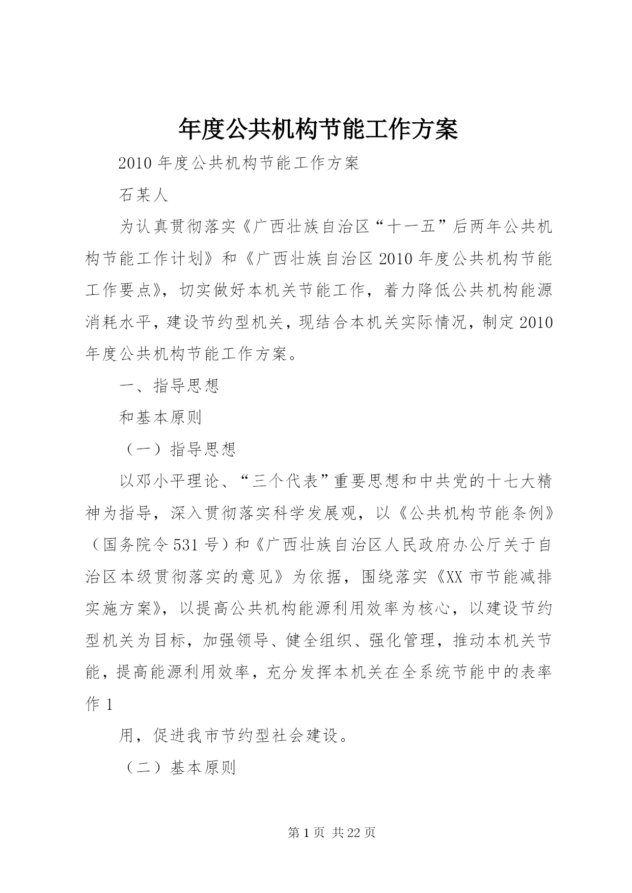 第PAGE\*Arabic\*MERGEFORMAT22页共NUMPAGES\*MERGEFORMAT22页年度公共机构节能工作方案2010年度公共机构节能工作方案石某人为认真贯彻落实《广西壮族自治区“十一五”后两年公共机构节能工作计划》和《广西壮族自治区2010年度公共机构节能工作要点》,切实做好本机关节能工作,着力降低公共机构能源消耗水平,建设节约型机关,现结合本机关实际情况,制定2010年度公共机构节能工作方案。一、指导思想和基本原则(一)指导思想以邓小平理论、“三个代表”重要思想和中共