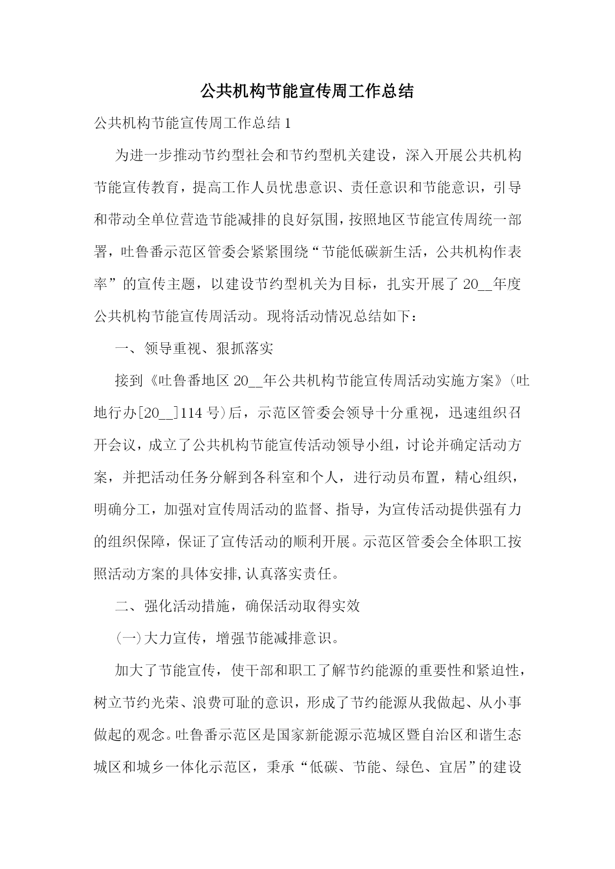 公共机构节能宣传周工作总结公共机构节能宣传周工作总结1为进一步推动节约型社会和节约型机关建设,深入开展公共机构节能宣传教育,提高工作人员忧患意识、责任意识和节能意识,引导和带动全单位营造节能减排的良好氛围,按照地区节能宣传周统一部署,吐鲁番示范区管委会紧紧围绕“节能低碳新生活,公共机构作表率”的宣传主题,以建设节约型机关为目标,扎实开展了20__年度公共机构节能宣传周活动。现将活动情况总结如下:一、领导重视、狠抓落实接到《吐鲁番地区20__年公共机构节能宣传周活动实施方案》(吐地行办[20__]114号)
