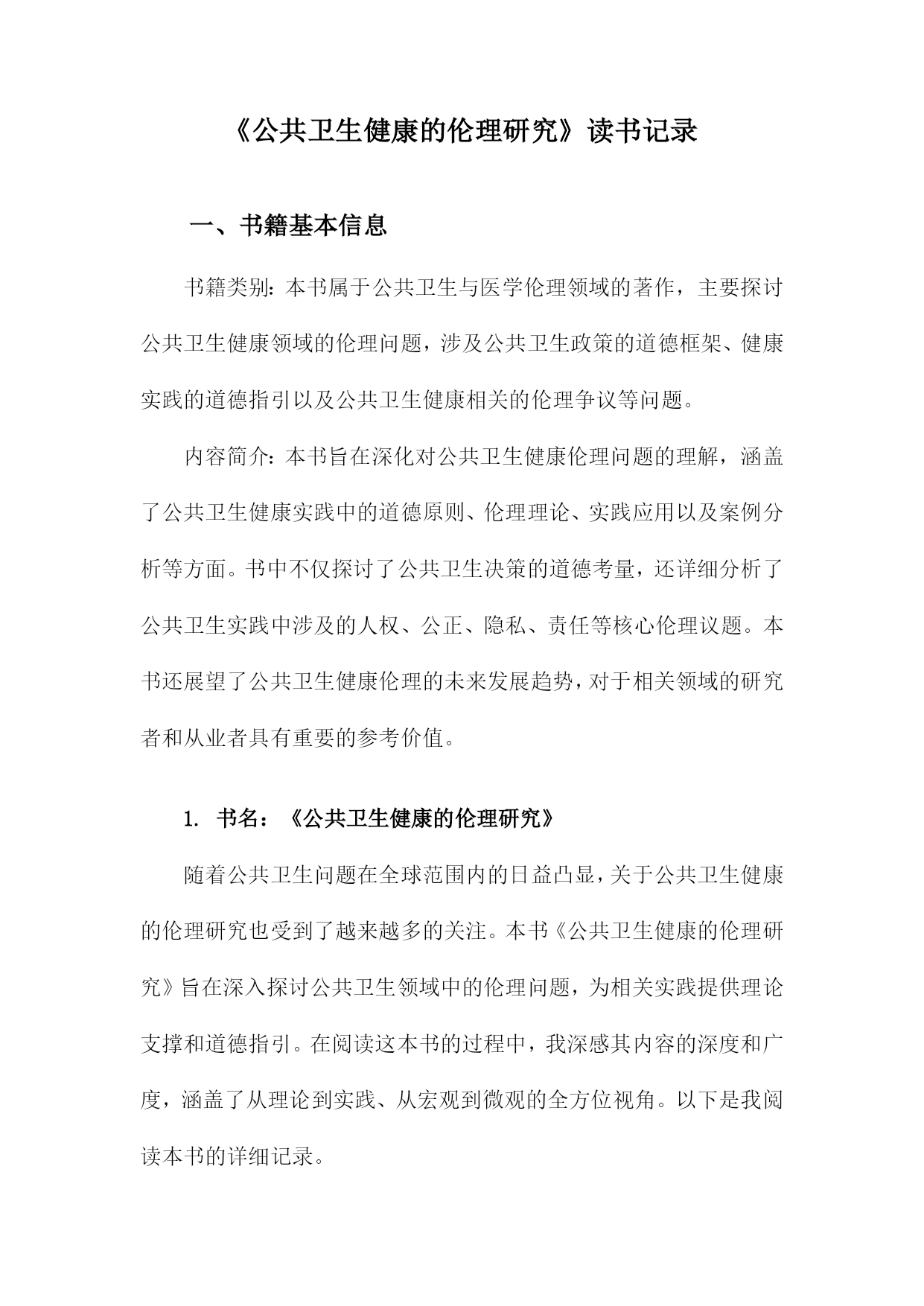 《公共卫生健康的伦理研究》读书记录一、书籍基本信息书籍类别:本书属于公共卫生与医学伦理领域的著作,主要探讨公共卫生健康领域的伦理问题,涉及公共卫生政策的道德框架、健康实践的道德指引以及公共卫生健康相关的伦理争议等问题。内容简介:本书旨在深化对公共卫生健康伦理问题的理解,涵盖了公共卫生健康实践中的道德原则、伦理理论、实践应用以及案例分析等方面。书中不仅探讨了公共卫生决策的道德考量,还详细分析了公共卫生实践中涉及的人权、公正、隐私、责任等核心伦理议题。本书还展望了公共卫生健康伦理的未来发展趋势,对于相关领域的